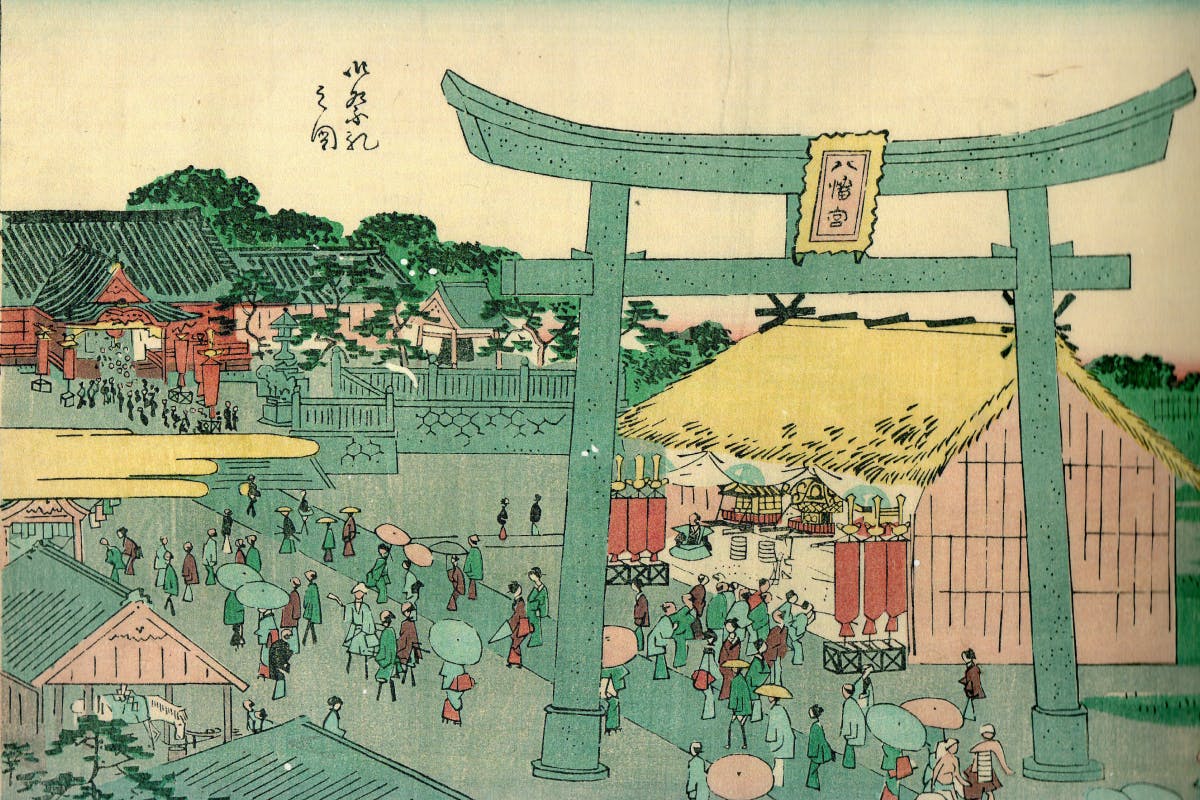 江戸時代の深川八幡祭りは、全国の八幡神社で行われる放生会(生き物を自然に放して徳を積む行事)に合わせ、旧暦8月の中秋(現在の9〜10月初旬)に催されていました。しかし、明治5年(1872年)の改暦によって日付が新暦へ移り、夏の行事となります。
