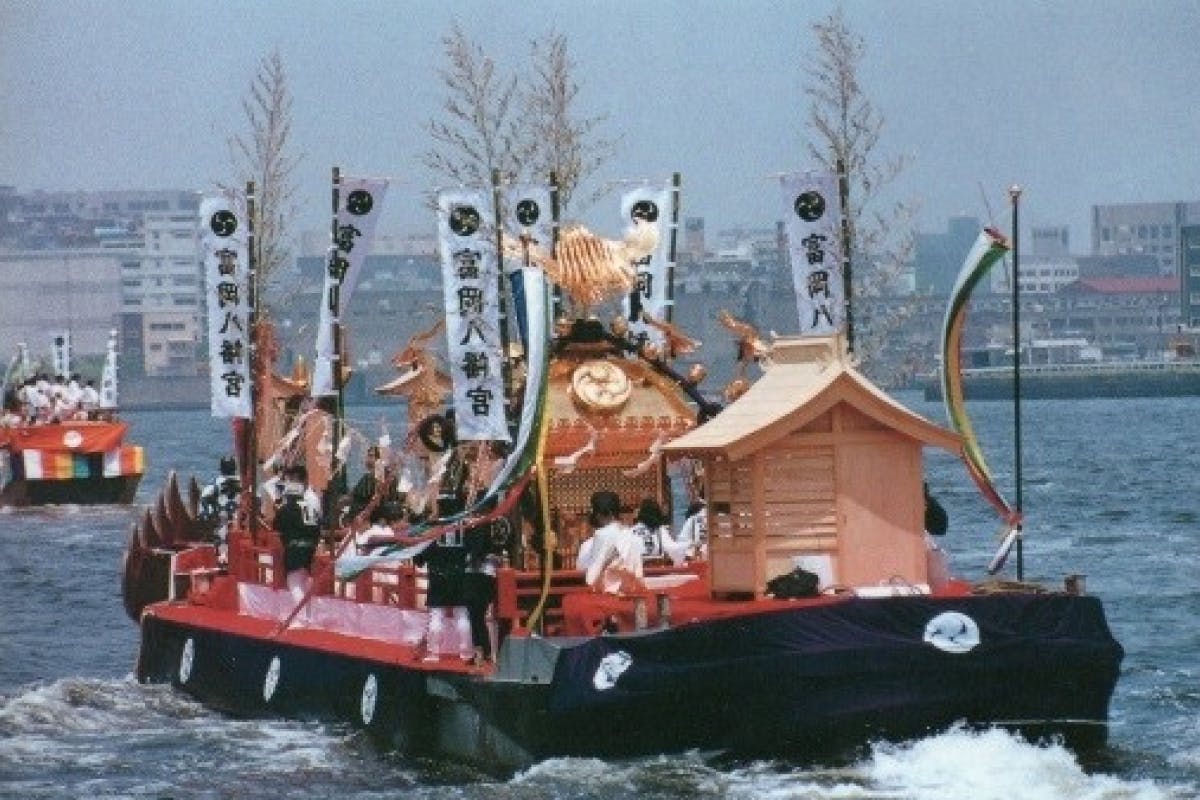 この神輿は行徳の浅子神輿店によって奉製されたものでした。奉納の際には、神輿を載せた御座船を先頭に15隻の大船団が東京湾を渡御し、永代橋で陸揚げ。その後、神輿を神社まで総勢800人で奉曳しました。