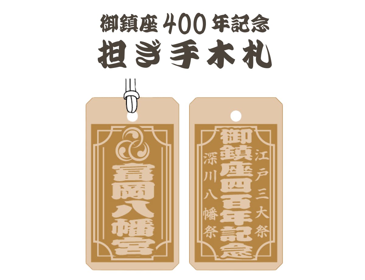 神輿渡御の際、担ぎ手が肌守りとして身に着ける檜の木札。裏面に「江戸三大祭 深川八幡祭」と「御鎮座四百年記念」の文字が彫られた、非常に特別な木札です。 (H65×W35×D5mm)
