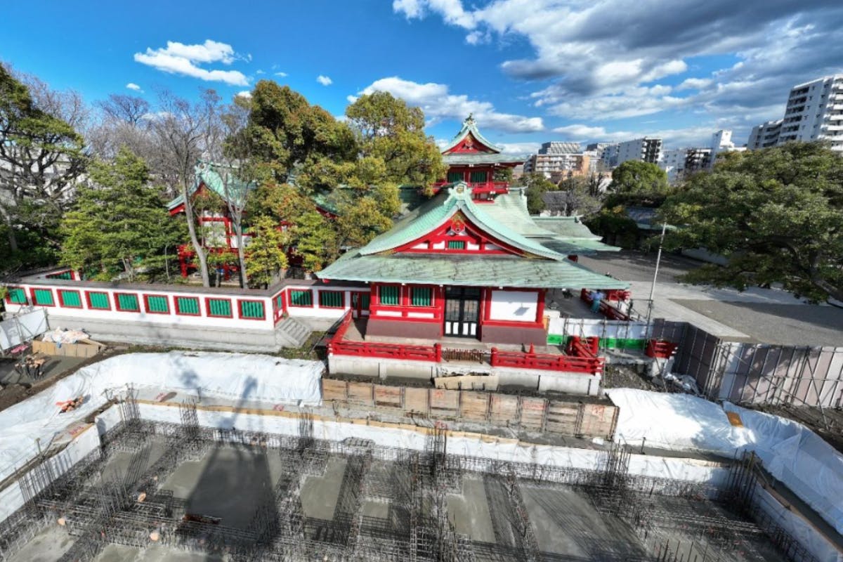 現在、御鎮座400年記念事業として、御社殿の大規模改修工事を進めています。現在の御社殿は、東京大空襲で焼失後、昭和31年(1956年)に再建されたもので、築70年を迎えて老朽化が進んでいます。首都直下地震などへの防災対策やバリアフリー化など、早急な改修が求められております。