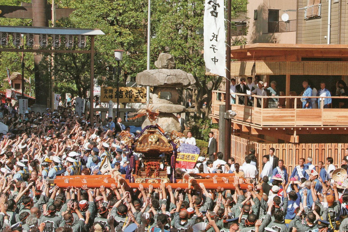 毎年8月15日前後に行われる「深川八幡祭り」は、1年ごとに「本祭り」「二の宮神輿渡御」「子供神輿連合渡御」と内容が異なります。なかでも「本祭り」では、氏子各町から50基以上の大神輿が勢ぞろいし、神輿連合渡御が行われます。その迫力は圧巻です。