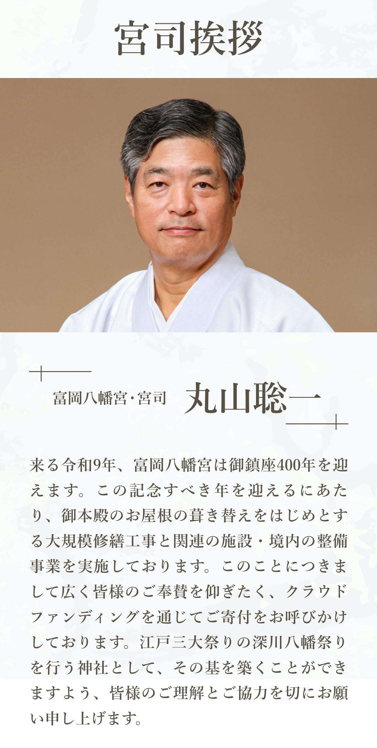 400年という長い歳月に支えられてきた富岡八幡宮の歩みに思いを馳せながら、これからの百年を、皆様と共に築き上げていきたいと願っております。この改修事業を通じて「神社を守る」ということが、「文化や人のつながりを未来へ残すこと」そのものであると感じていただけたら幸いです。
