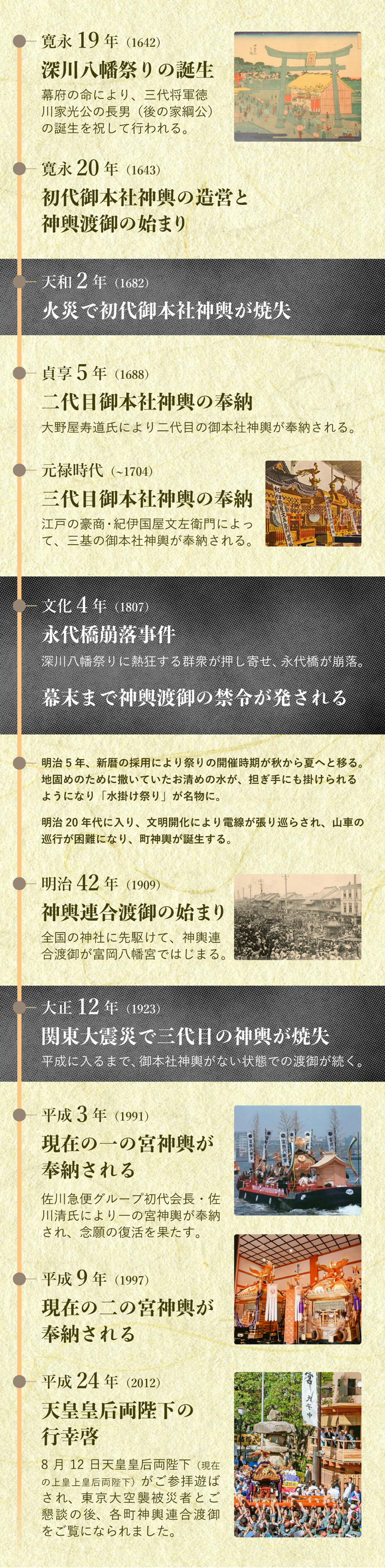 多くの人々に愛されてきた深川八幡祭りですが、その歩みは決して平坦ではありません。祭りが生まれたのは江戸時代前期。神社の創建から約15年後、寛永19年(1642)です。そこから今日まで、様々な危機に見舞われながらも、人々の篤い信仰によって受け継がれてきました。