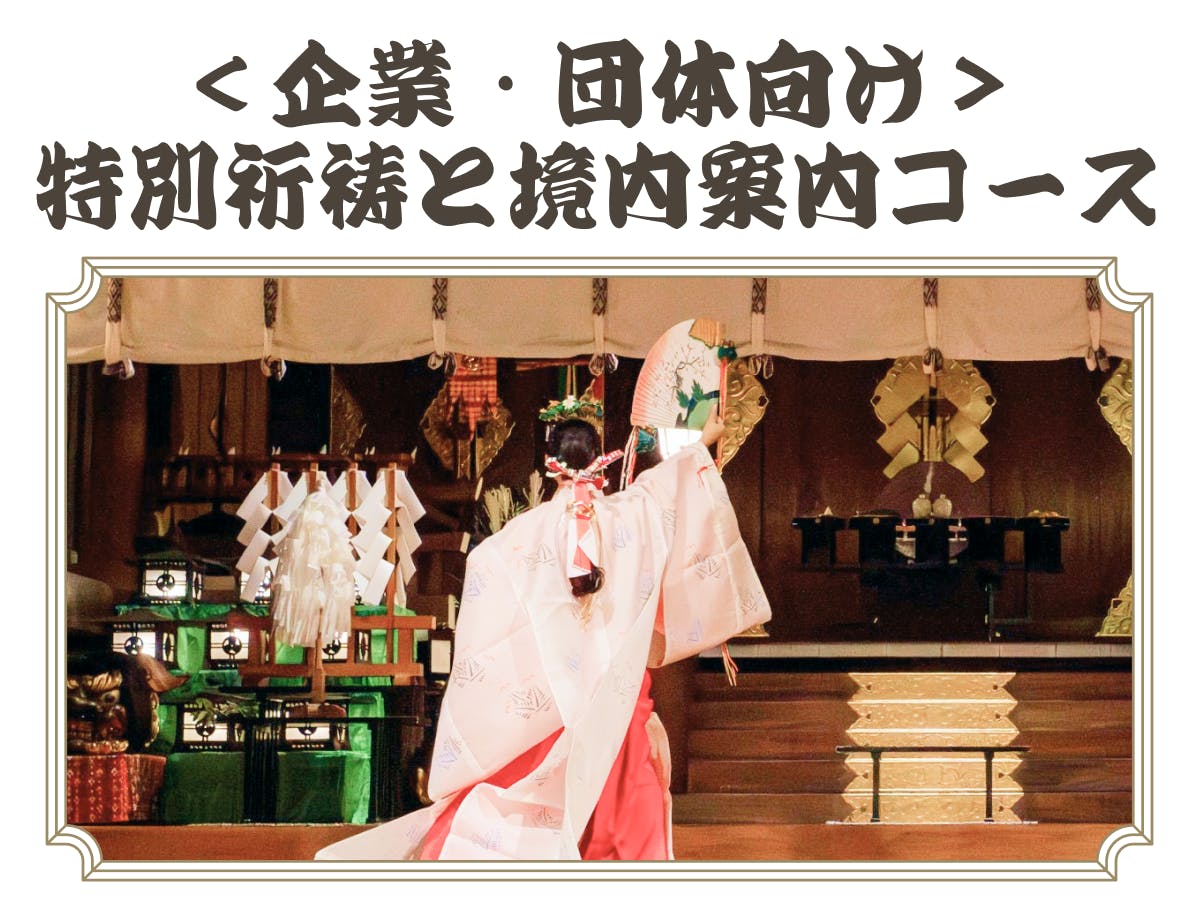 企業・団体様を対象とした特別祈祷です。会社の繁栄や社員の健康安全を神前で祈願いたします。その後、境内の特別案内も皆様でお楽しみいただけます。
