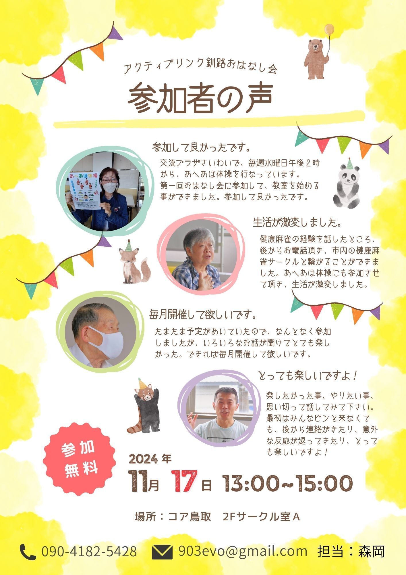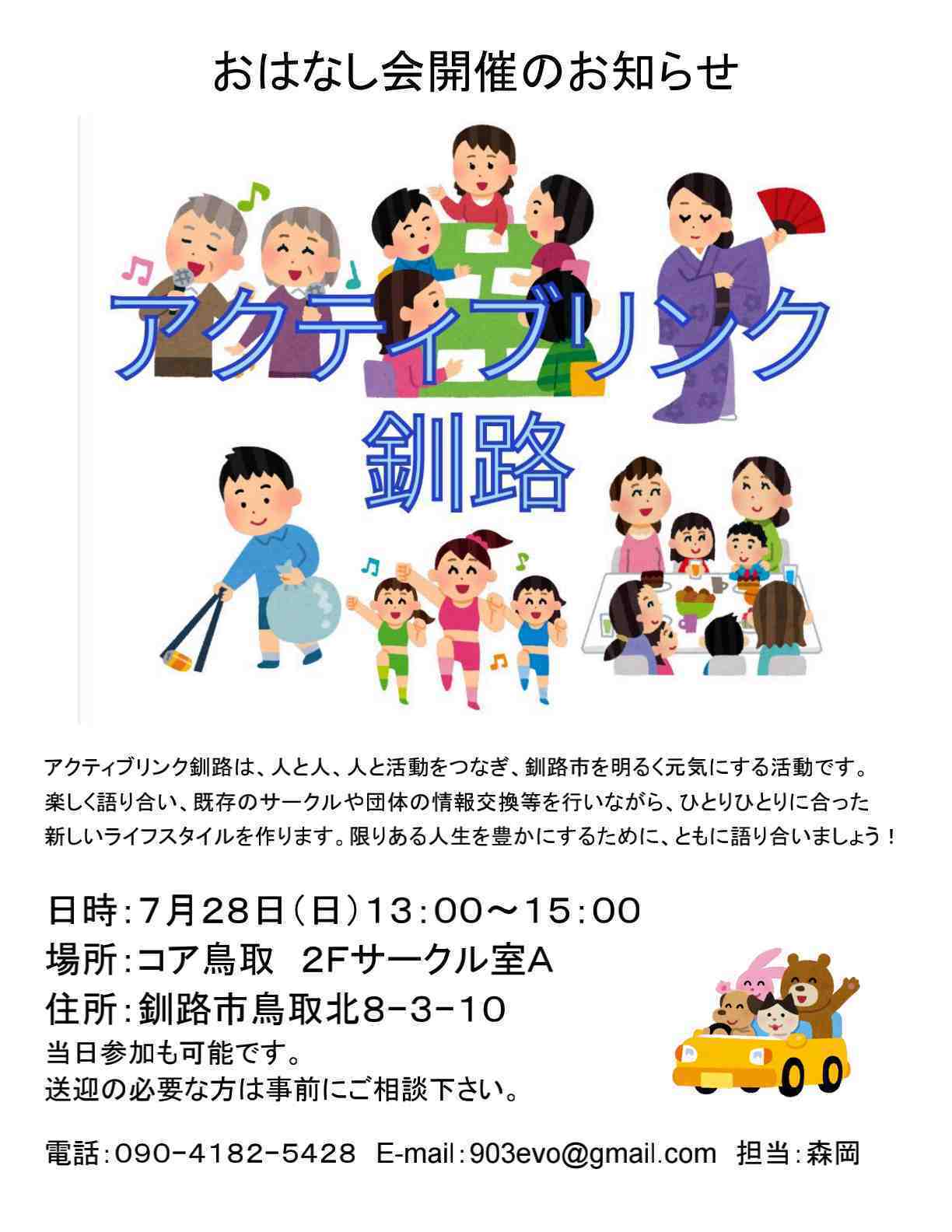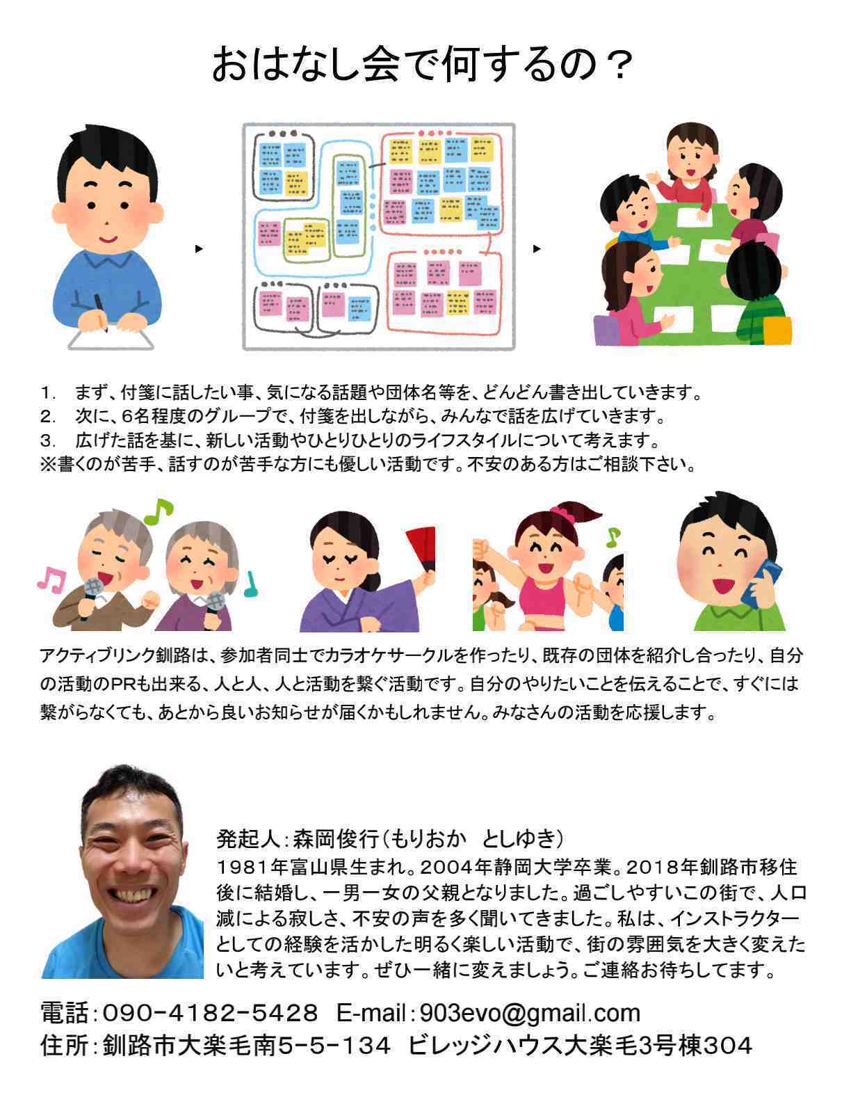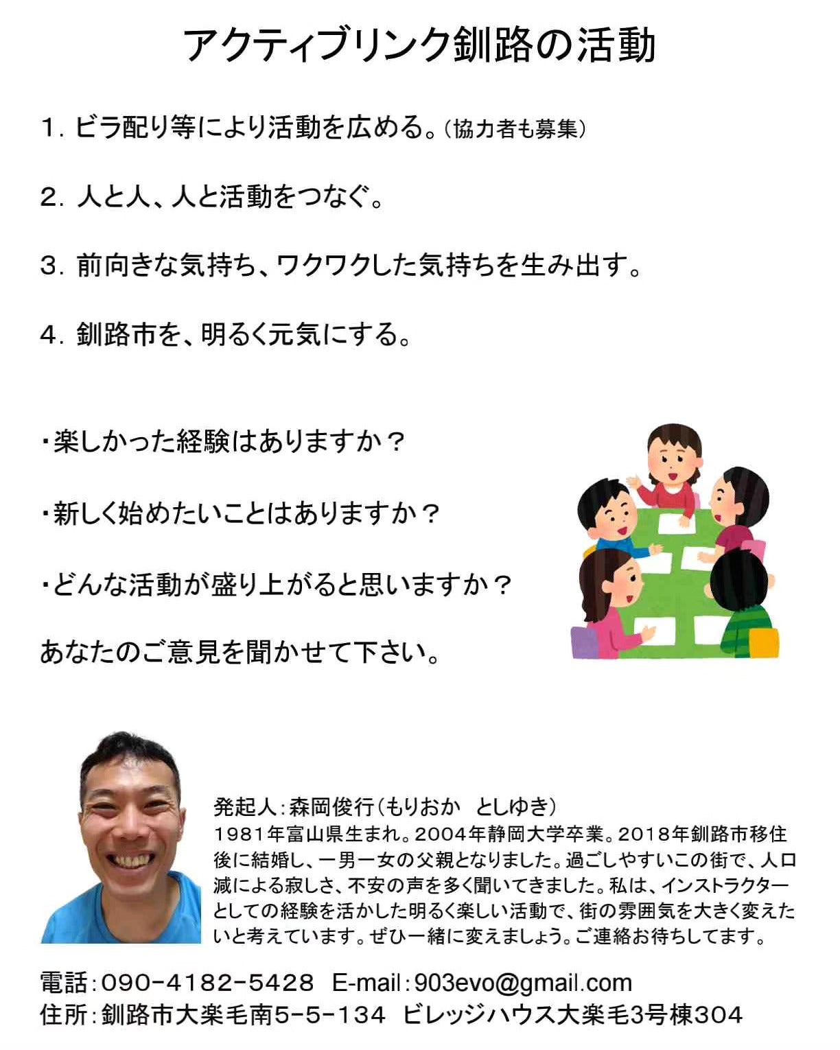 こんにちは。私の名前は森岡俊行です。北海道釧路市で「アクティブリンク釧路」という活動を始め、これまでに、7000枚以上のチラシを配布し、3回のおはなし会を開催してきました。私は、この活動をきっかけに、低迷する日本経済の流れを変えるような、新しい社会のあり方を示していけると考えていました。