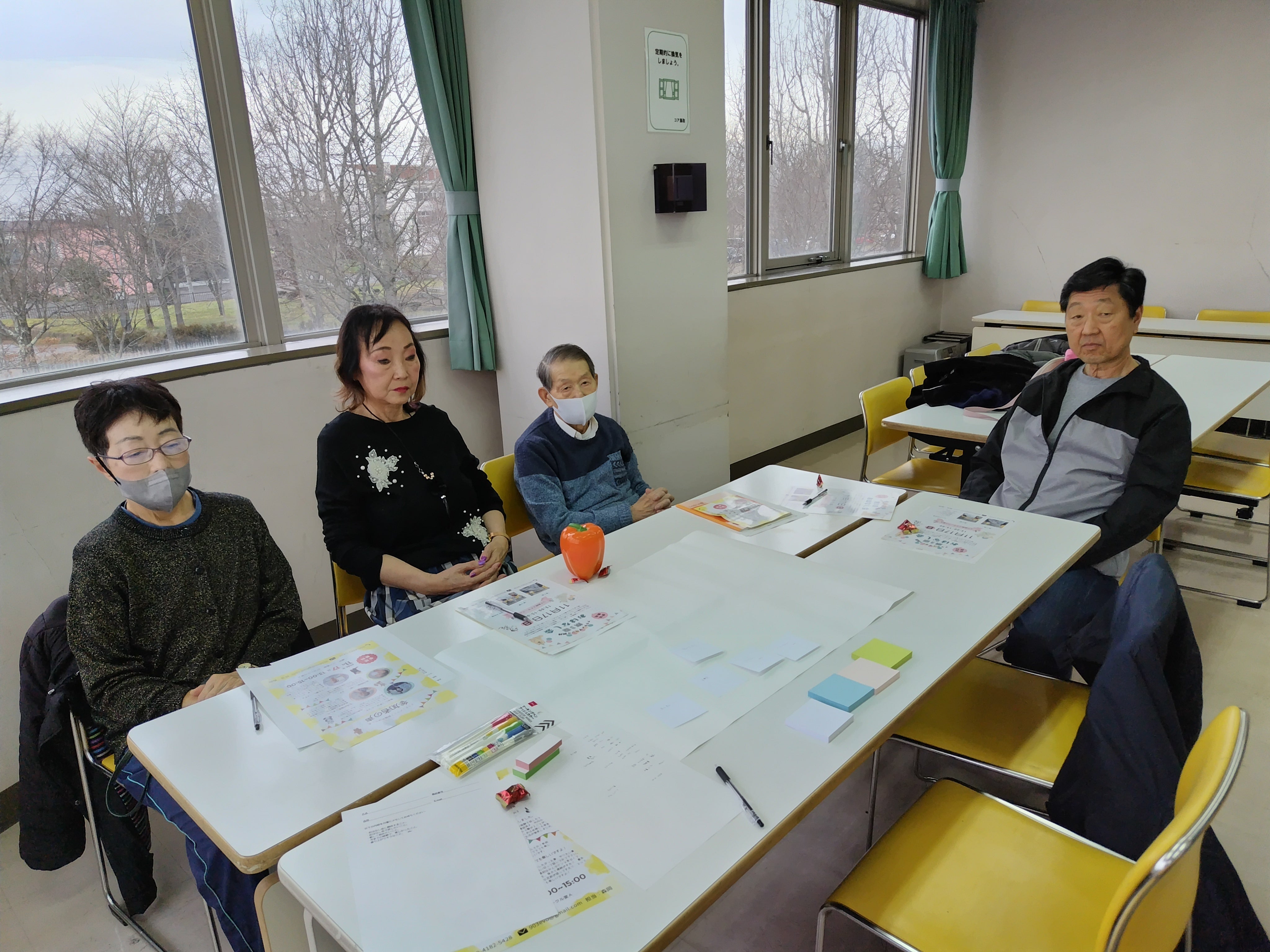 (右手前)上田さんは、毎週木曜日の体操教室のチラシを作成し、どのように参加者を集めて教室を開始するか悩まれていたため、今回の会に参加されました。