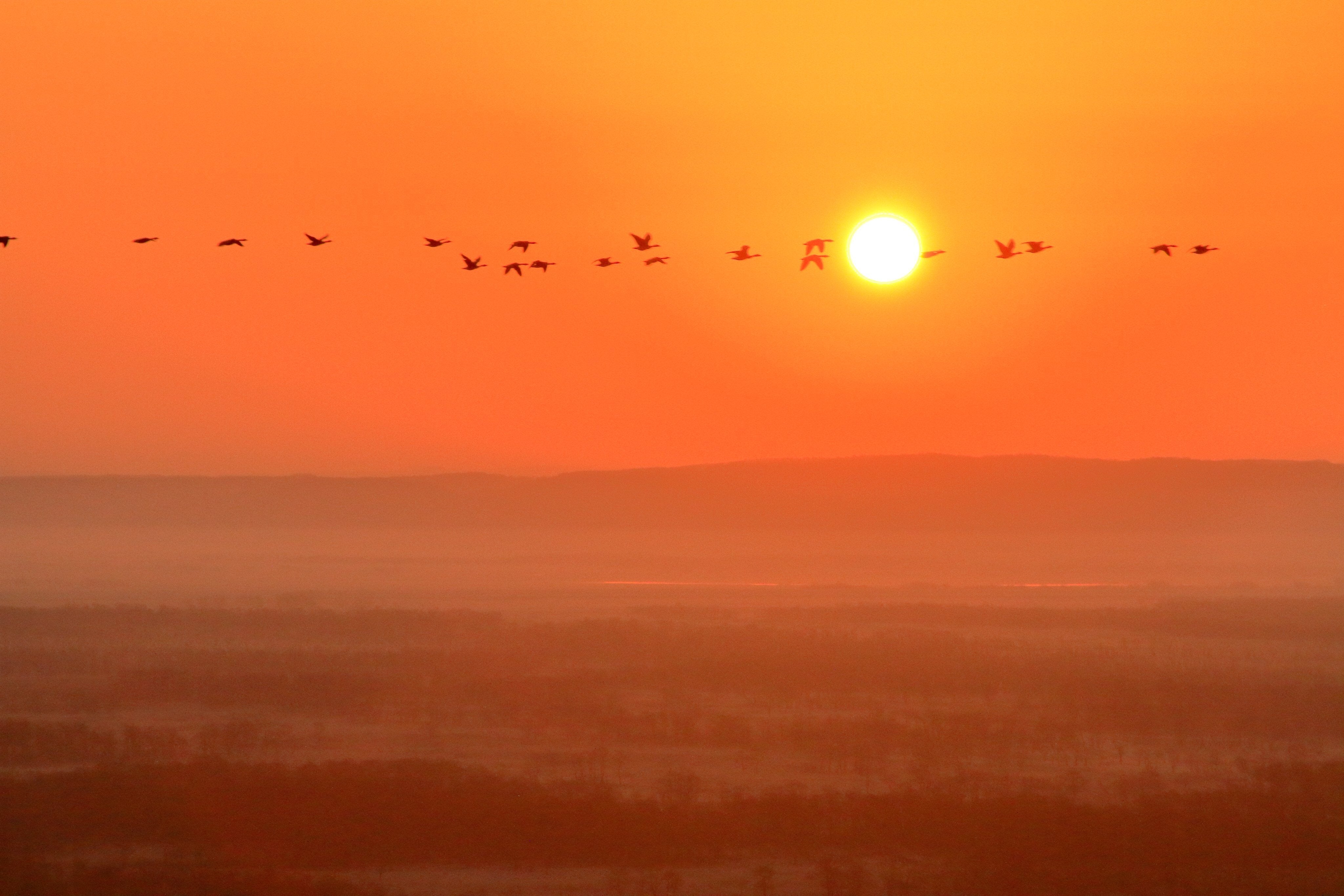 写真は、北斗展望台から見える朝日と丹頂鶴の群れです。