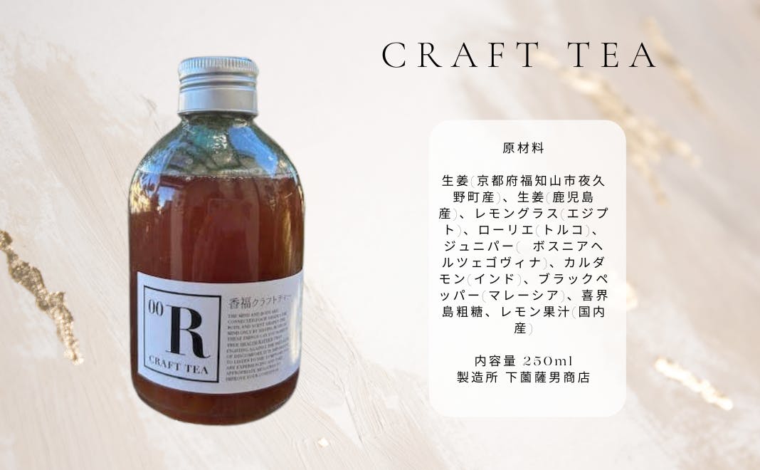 「クラフトティー香福 R00」は、自然豊かな京都府福知山市で育まれた地元の恵みを活かした特別な一品です。夜久野町で採れる「生姜」を熟成し惜しみなく使用。それらをレモングラスの爽やかな香りとともに調和させています。さらに、月桂樹や黒胡椒、桂皮といった和漢植物、ジュニパー、カルダモン、レモンなどが独特の深みと心地よい後味を生み出します。ほっと一息つきたい時、大切な人との時間に、食後や就寝前の一杯にぜひお楽しみください。一杯の香福を片手に自然の恵みを感じる贅沢なひとときとなることでしょう。