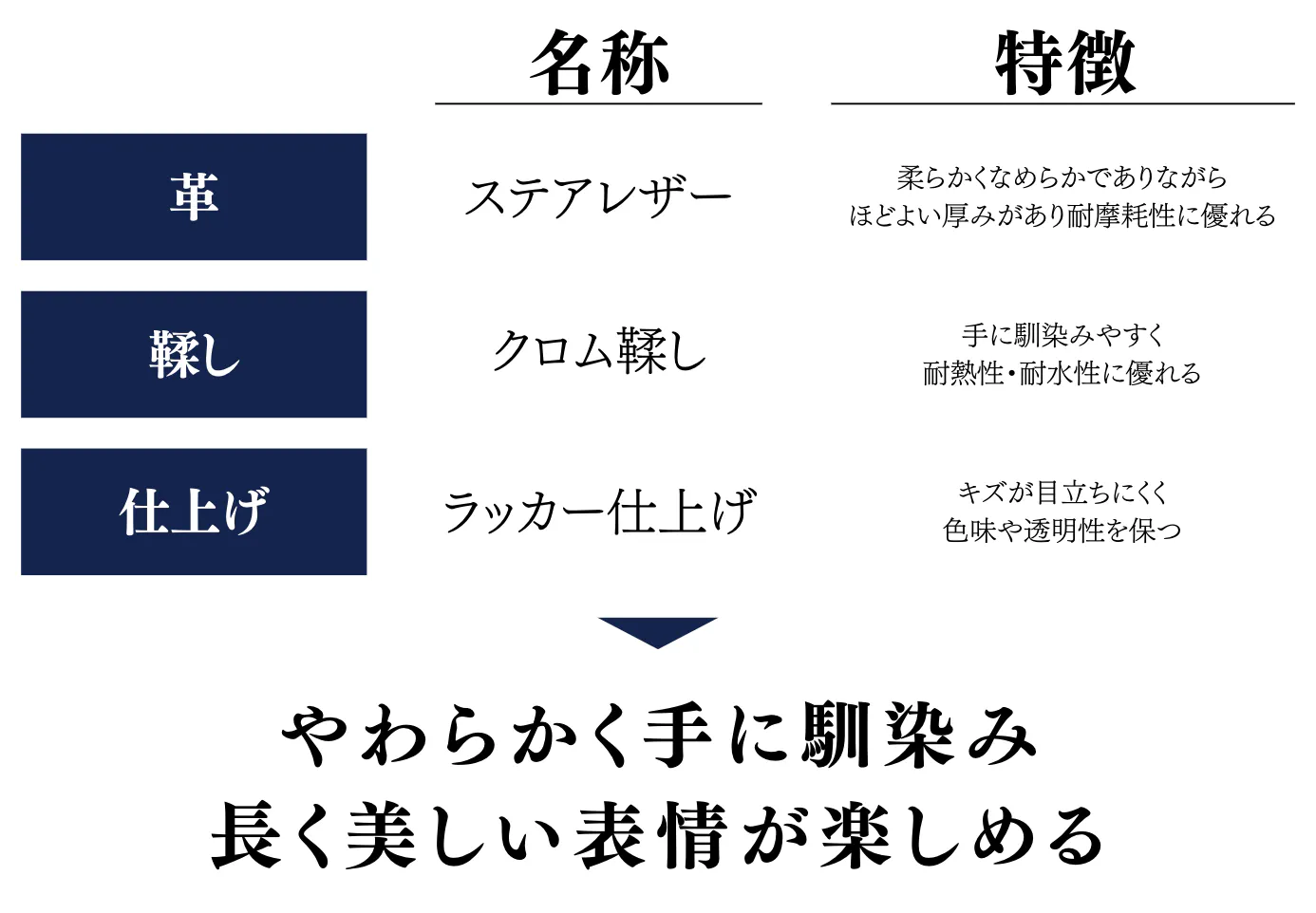 クロムで丁寧になめし、仕上げに光沢あるラッカー染料で化粧を施す。