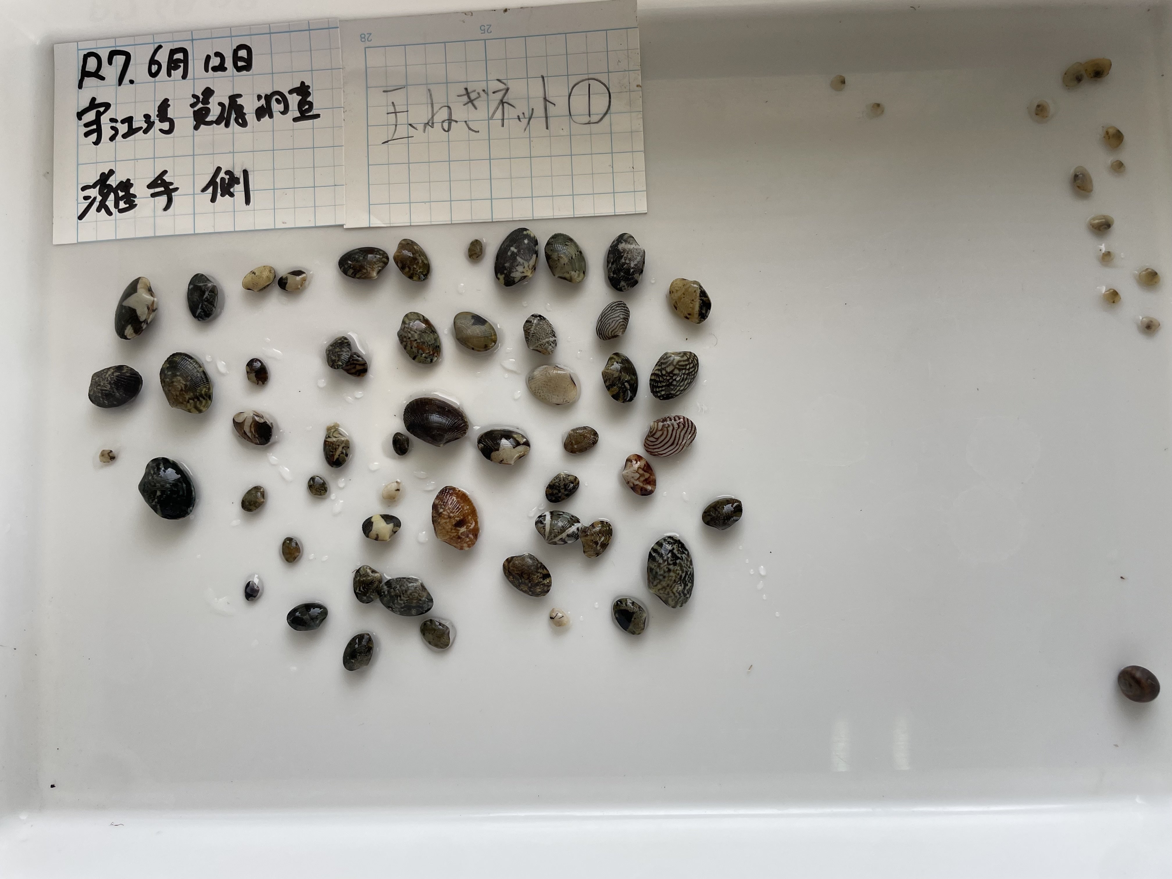 今年の春先の大潮の時に 大分 杵築 守江湾の干潟の砂を1m2程度の面積の砂を玉ねぎ袋に入れました。その砂の中には目に見えない0.1mm〜1mm程のアサリの稚貝がいます。その稚貝が2ヶ月経過するとこんなに大きくなりました。
