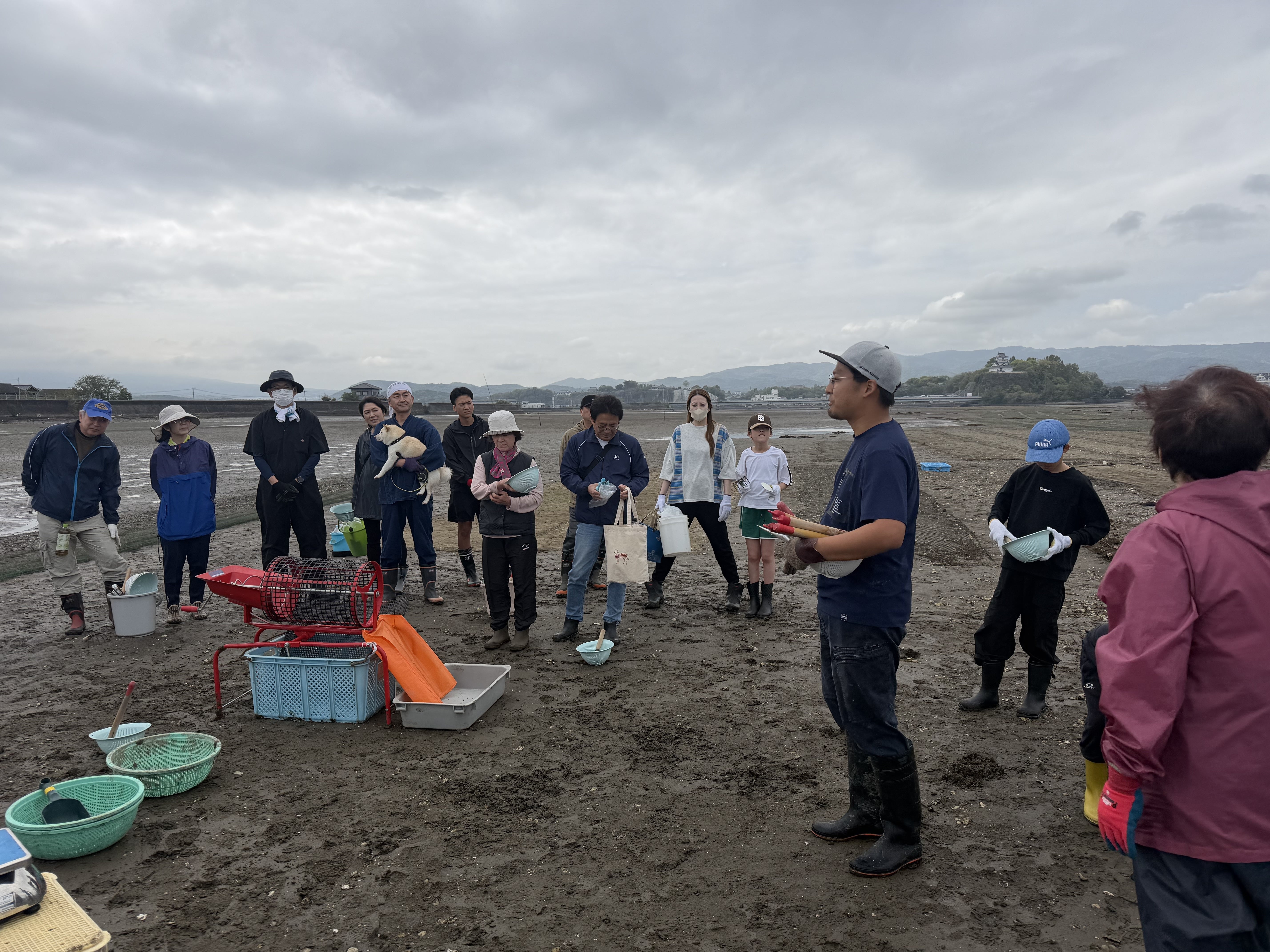 本日の会場は杵築城の城下の納屋地区の干潟です。多くのクラウドファンディングの支援者の皆様に集まって頂きました。