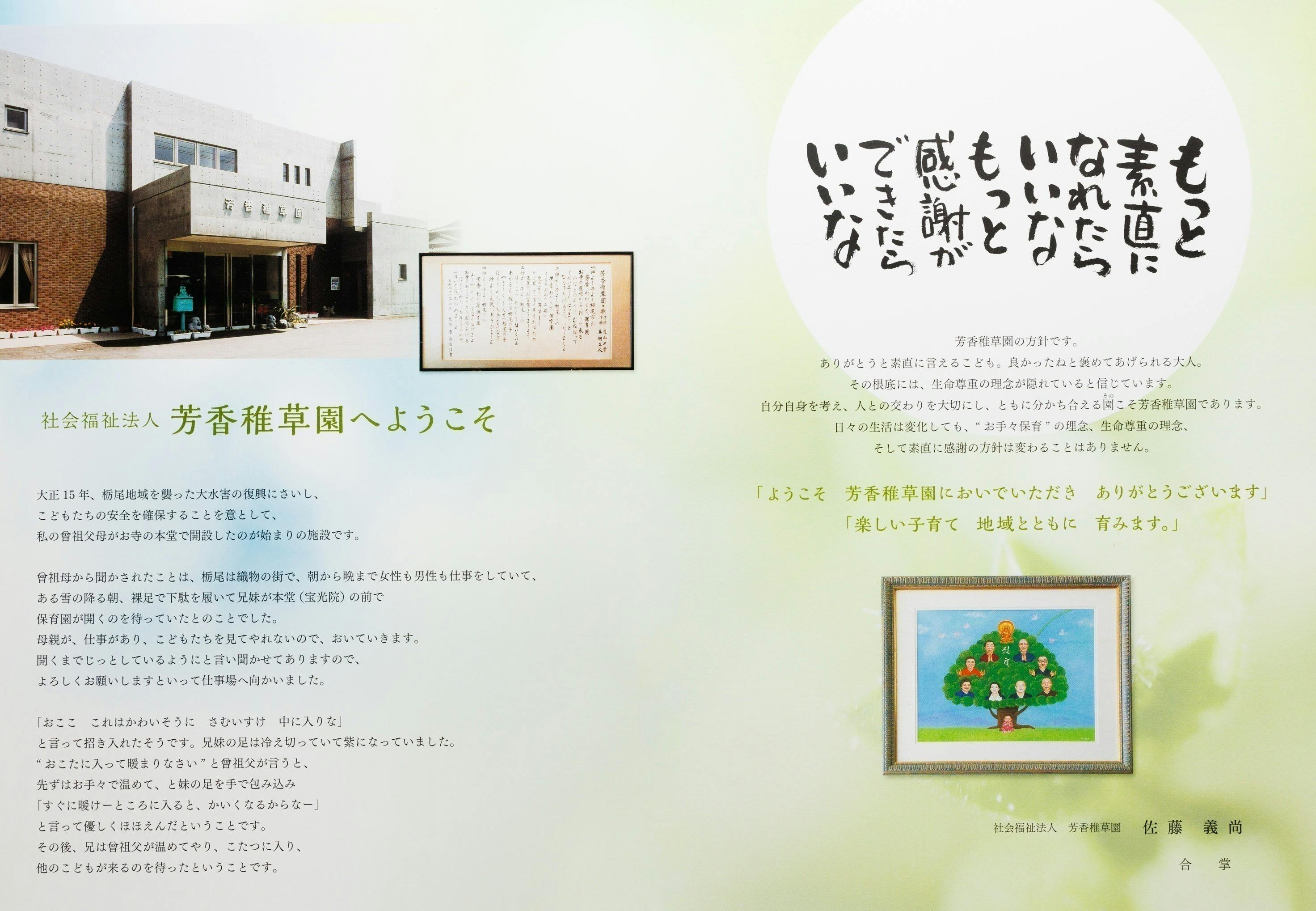 当園は大正15年、新潟県長岡市栃尾地域を襲った大水害の復興にさいし、こどもたちの安全を確保することを意として、私の曾祖父母がお寺の本堂で開設したのが始まりの施設です。こどもたちを愛しむこの初心を忘れずに未来へつなげて参ります。