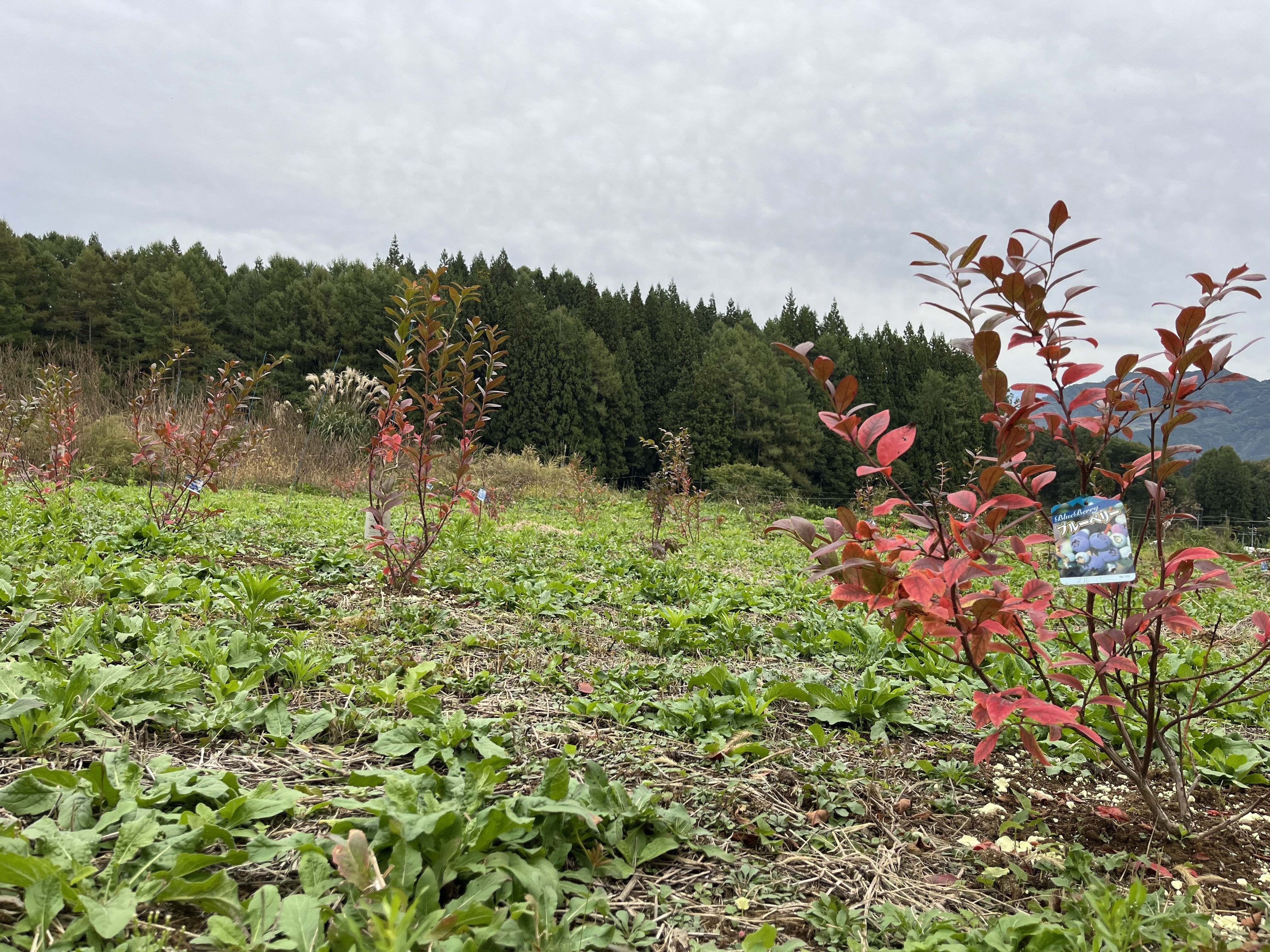 皆さまからのご支援を使わせて頂き、購入したブルーベリーの苗木達も紅葉が進み、赤く色づいています。