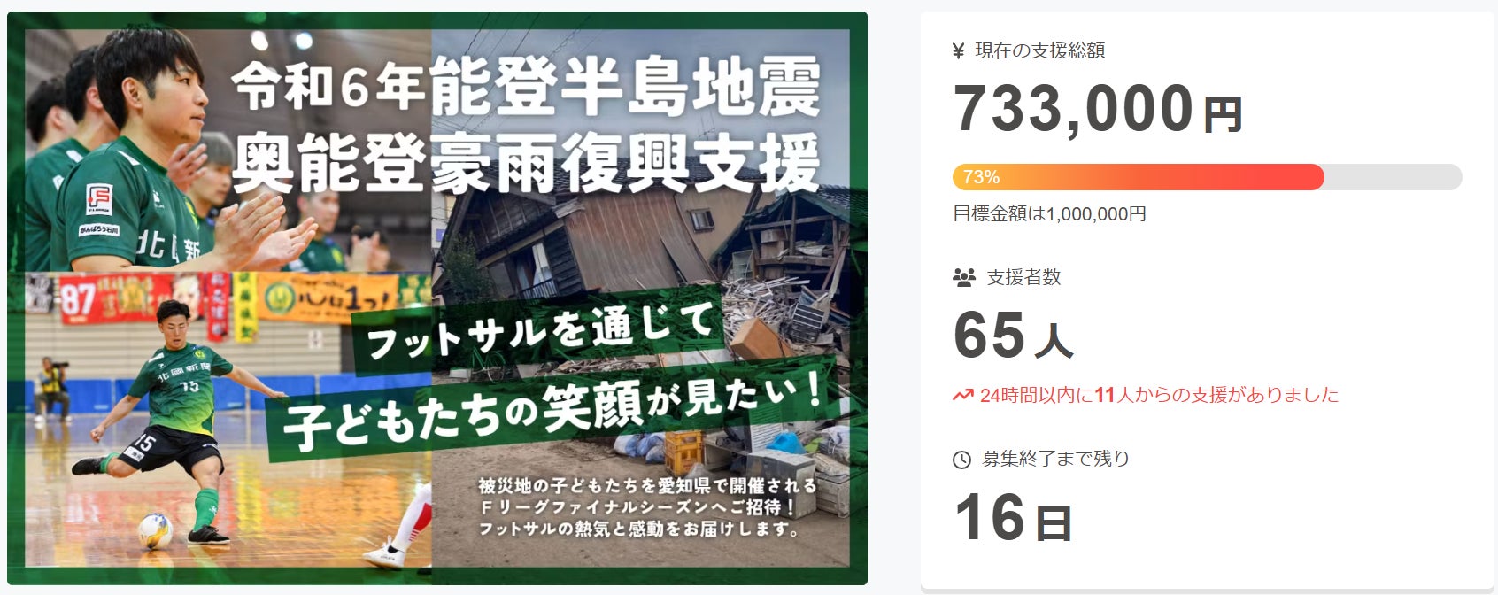 【目標70%達成いたしました!!】たくさんご支援いただき、誠にありがとうございます!65名の方に賛同いただき、ここまで到達することができました。ここ数日、フットサルファミリーの皆さまからの多大なるご支援にあらためて力強いパワーを感じ、励まされております!ご支援いただいた皆さんへヴィンセドール白山の選手からのメッセージをお受け取りください!70%まで到達しましたが子どもたちの笑顔を実現するためにここで満足するわけにはいきません……!目標額まではあと一歩の踏ん張り時です!もうひと踏ん張りできるよう、支えていただけるとうれしいです。引き続き、温かいご支援とご声援をよろしくお願いいたします!