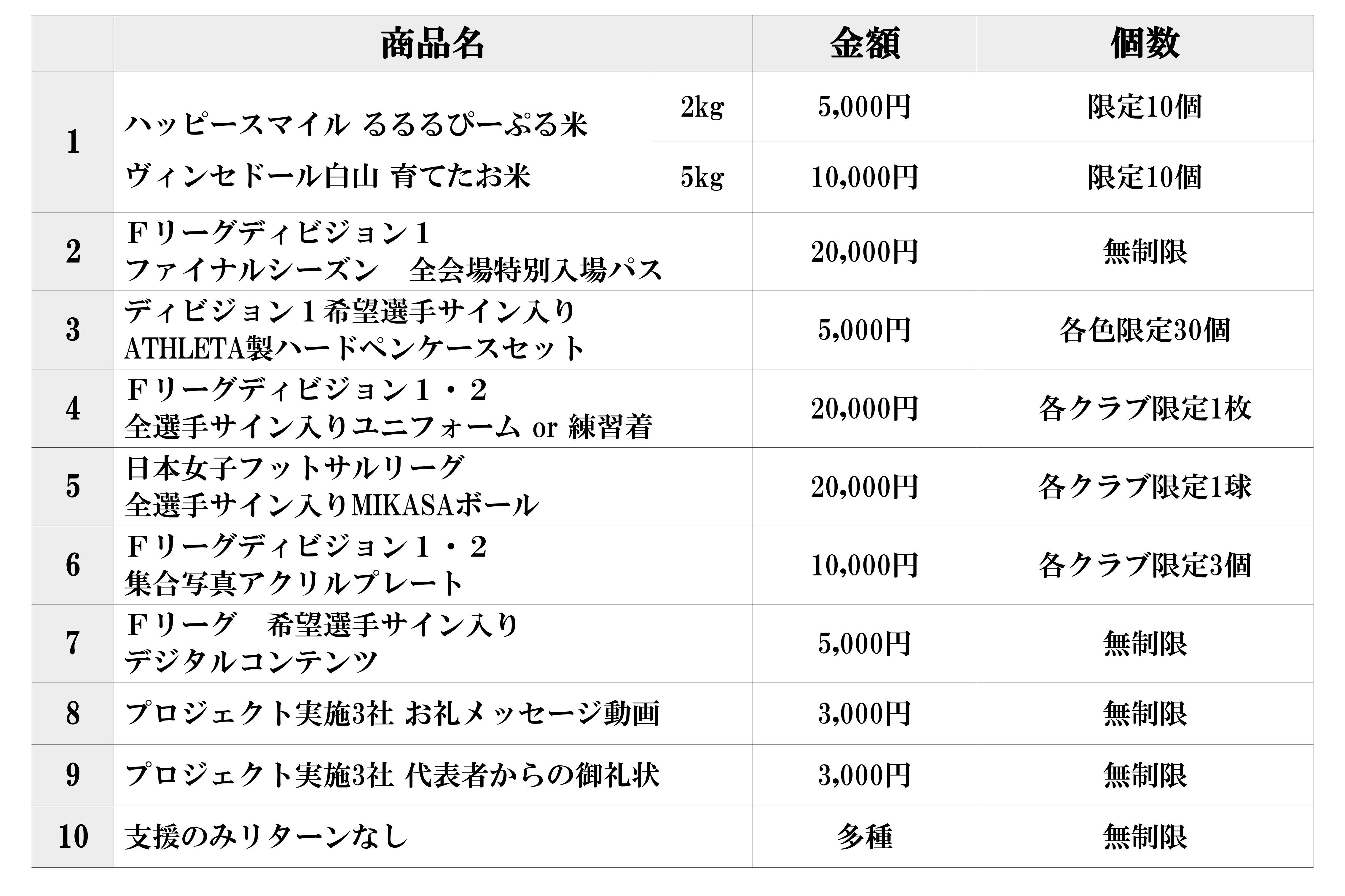 賛同いただいたFリーグ加入クラブから選手のサインが入った特別なグッズやユニフォームに加え、ヴィンセドール白山の選手たちが地域の皆さまと一緒に作ったお米をご用意しました!