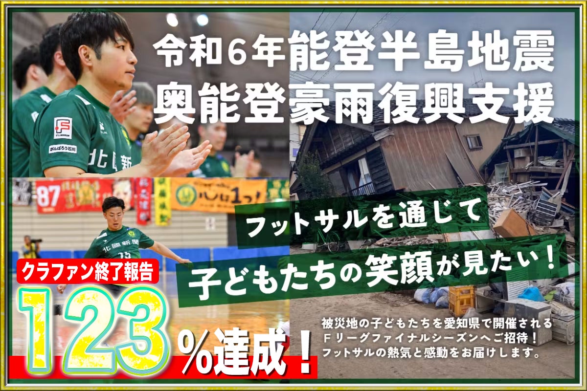 この度Fリーグは、2024年1月に発生した能登半島地震、また9月に発生した奥能登豪雨の復興支援を目的としたクラウドファンディングプロジェクトへ挑戦いたします。 再建に向け一歩一歩力強く歩まれていた中で被災されたすべての皆さまに心よりお見舞いを申し上げます。