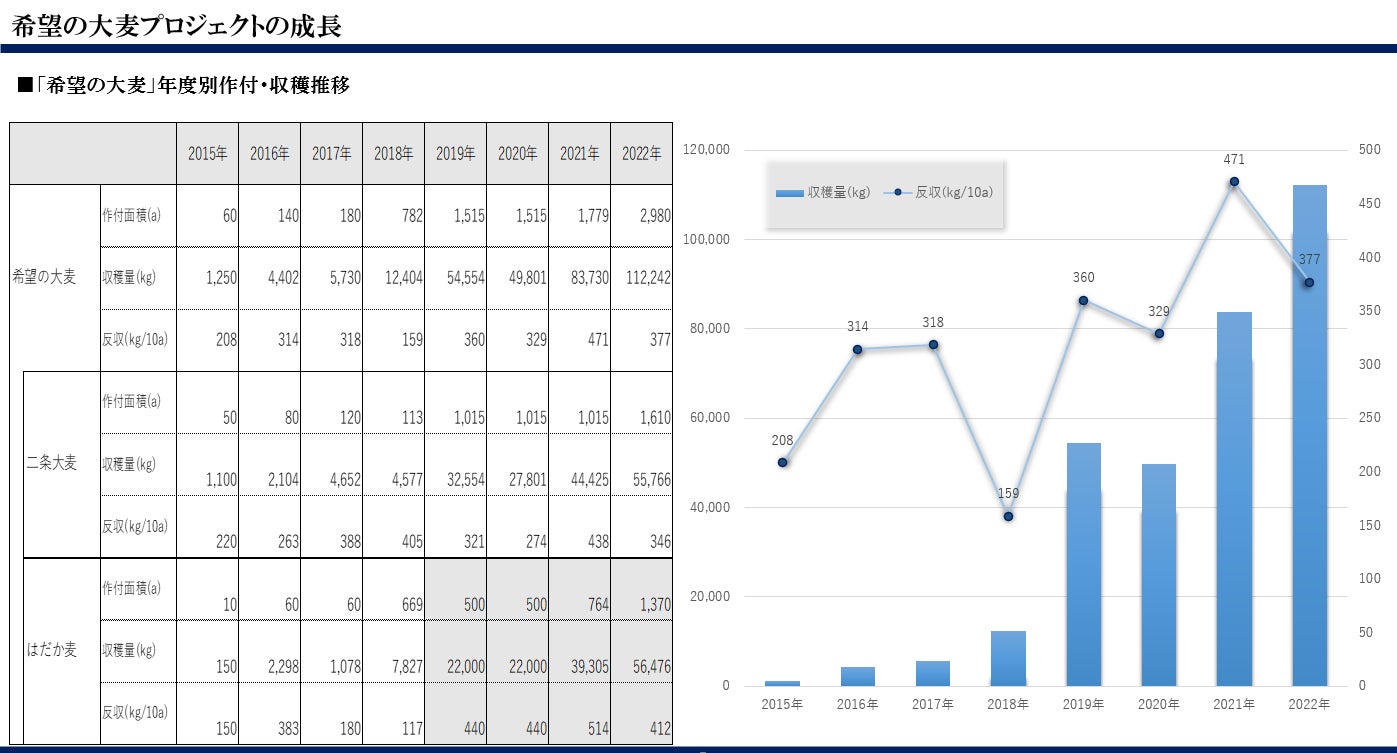 これまで、農業法人様と共に「希望の大麦プロジェクト」に邁進してきました。本プロジェクトにご賛同いただき、購入頂ける事業様も増えてきましたが、現状麦の市場環境は安価の海外産シェアが高く、物価上昇が続いていくとお取引の持続性が不透明であり、市内消費の確立が喫緊の課題でした。