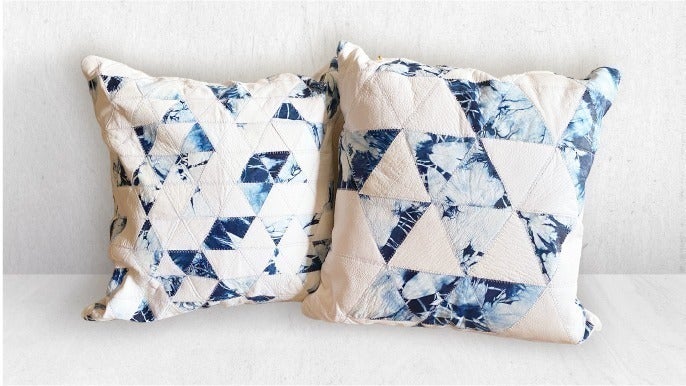 鹿革に藍染を施した生地を、三角形でデザインしたクッションです。