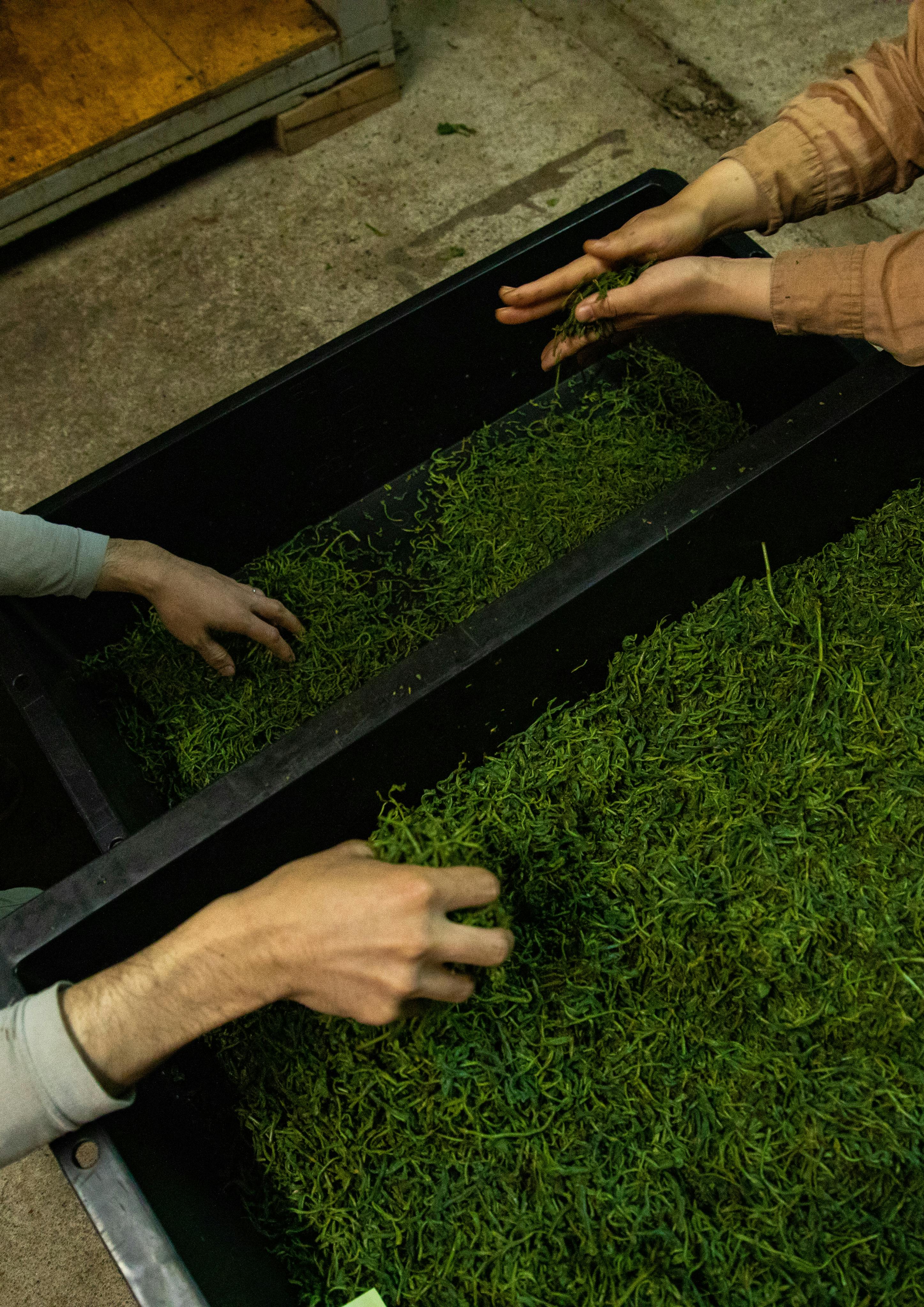 手揉み作業後は、茶葉を静置し発酵させます。