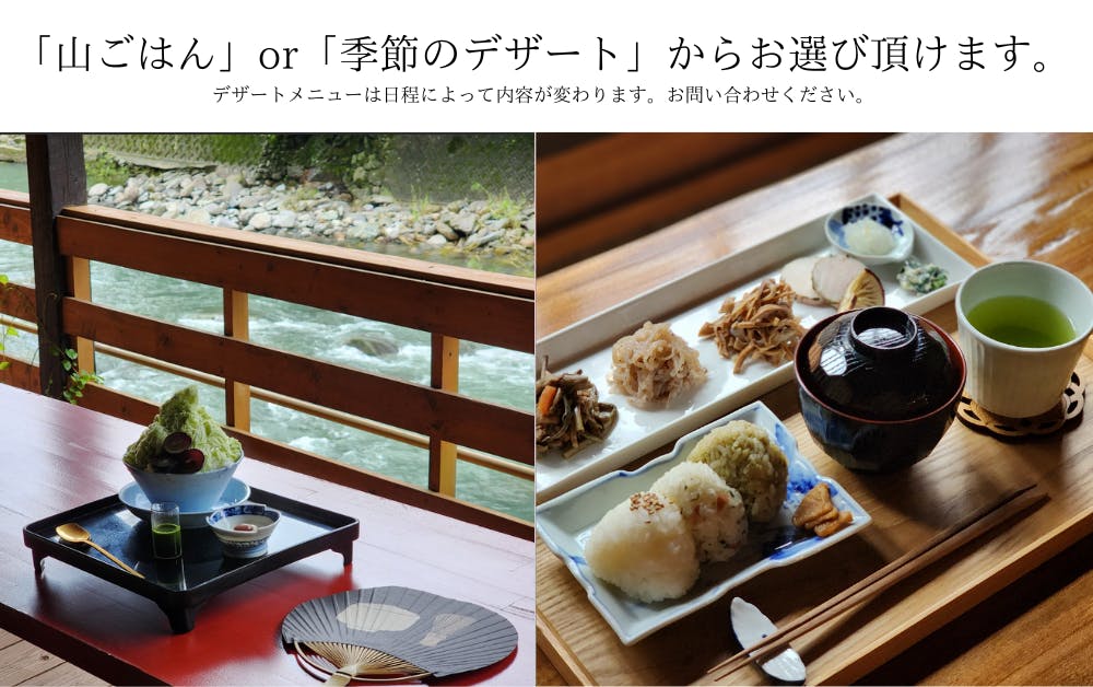 お食事は「山ごはん」or「季節のデザート」からお選び頂けます。昼食後、矢部紅茶からオススメの4品種を飲み比べワークショップを行います。