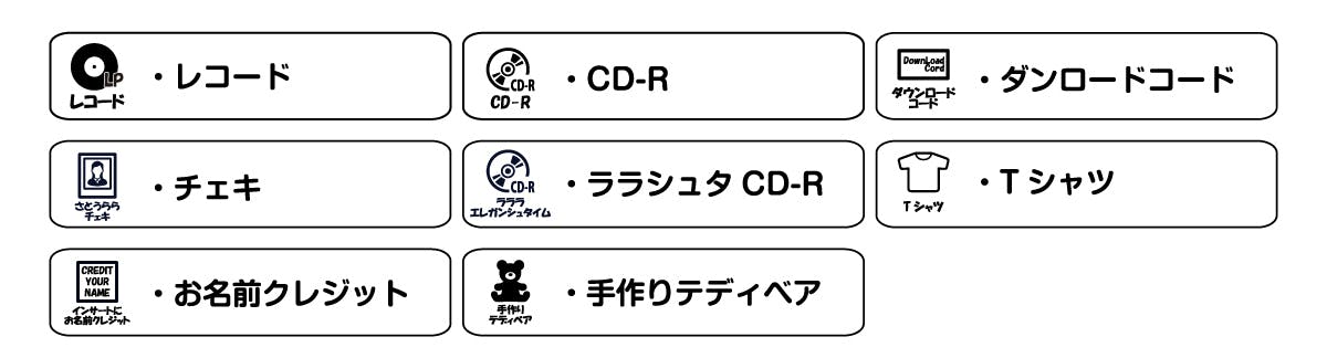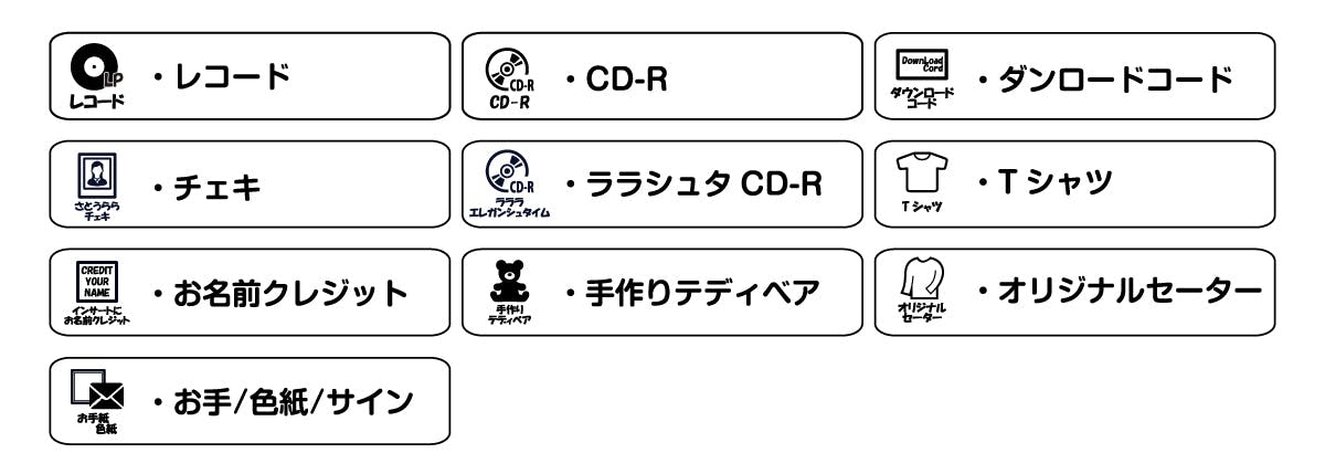 < 手紙/色紙/インサートにサイン + テディベア + Tシャツ + オリジナルセーター + お名前クレジット + チェキ + ラジオCD-R + レコード + CD-R + ダウンロードコード >