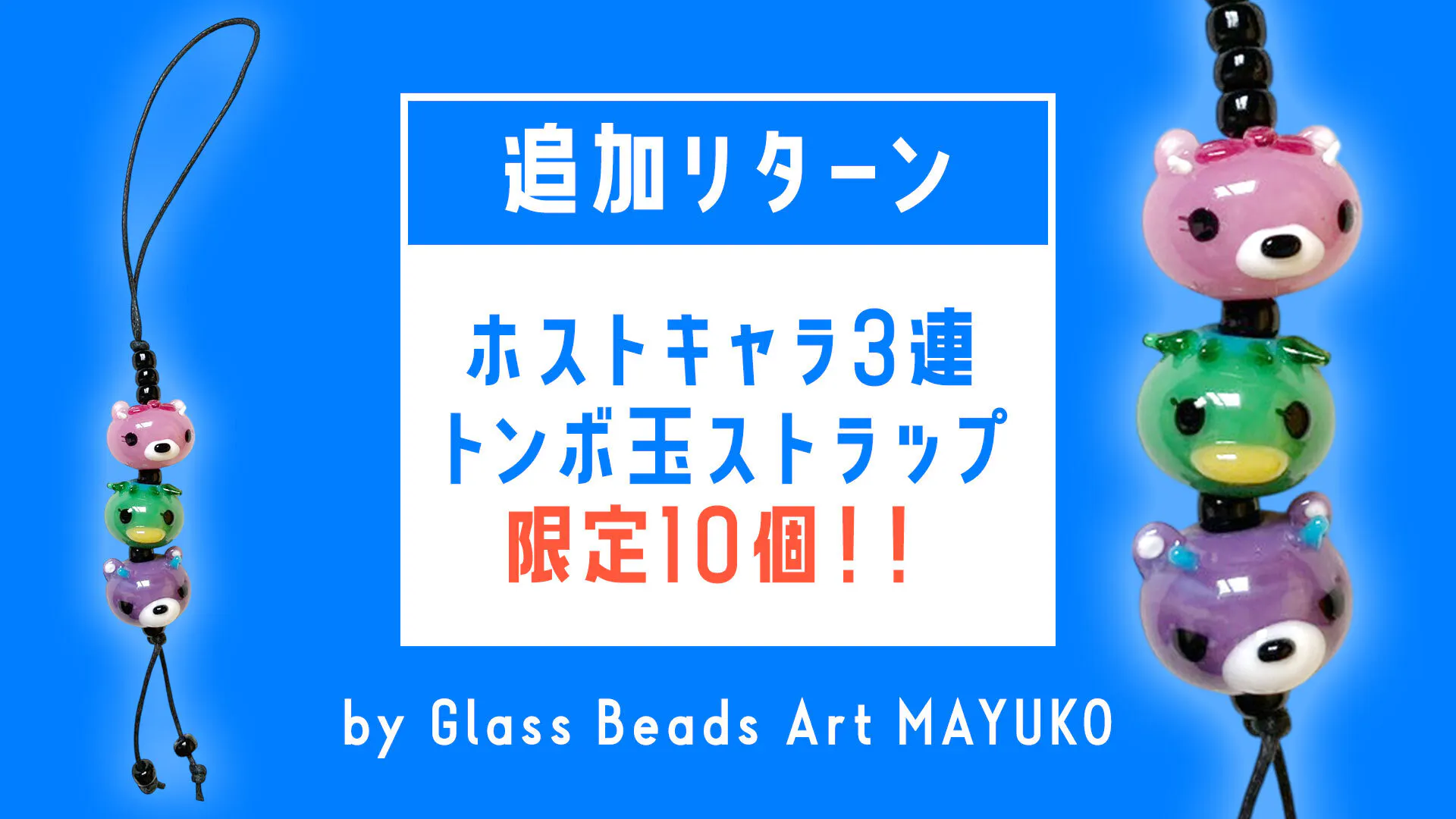 小樽のガラス作家「Glass Beads Art MAYUKO」様によるホストキャラクター3連トンボ玉ストラップが追加リターンとして登場しました!