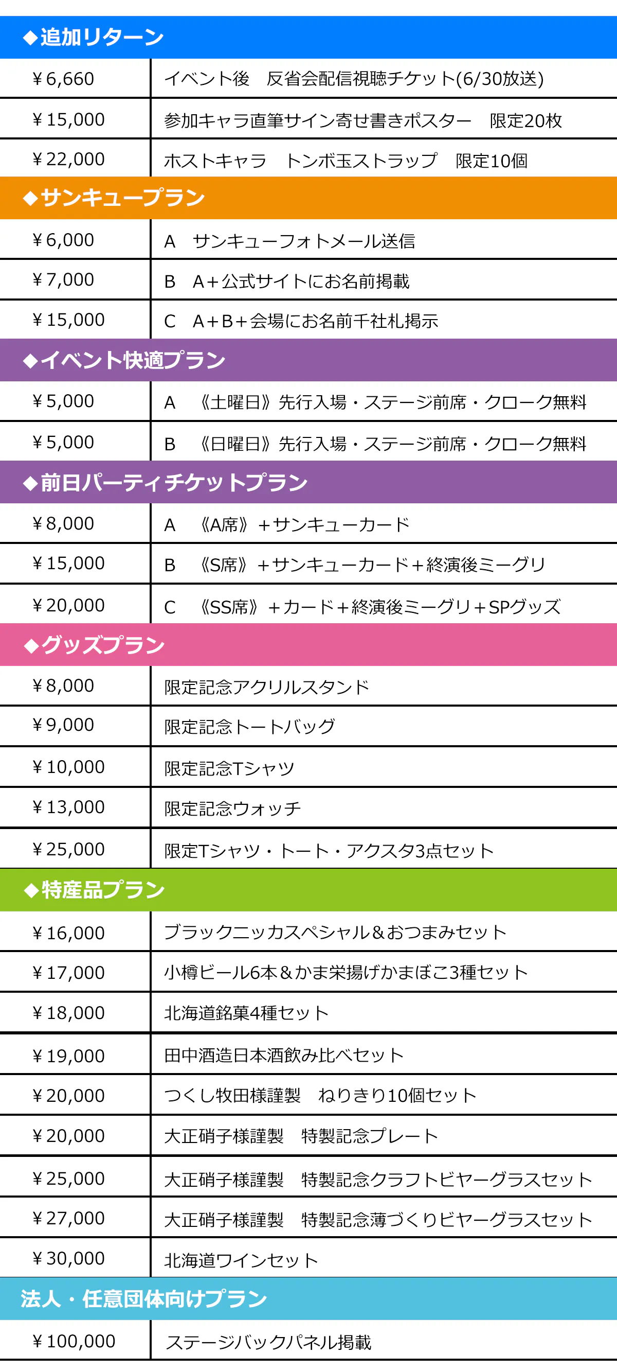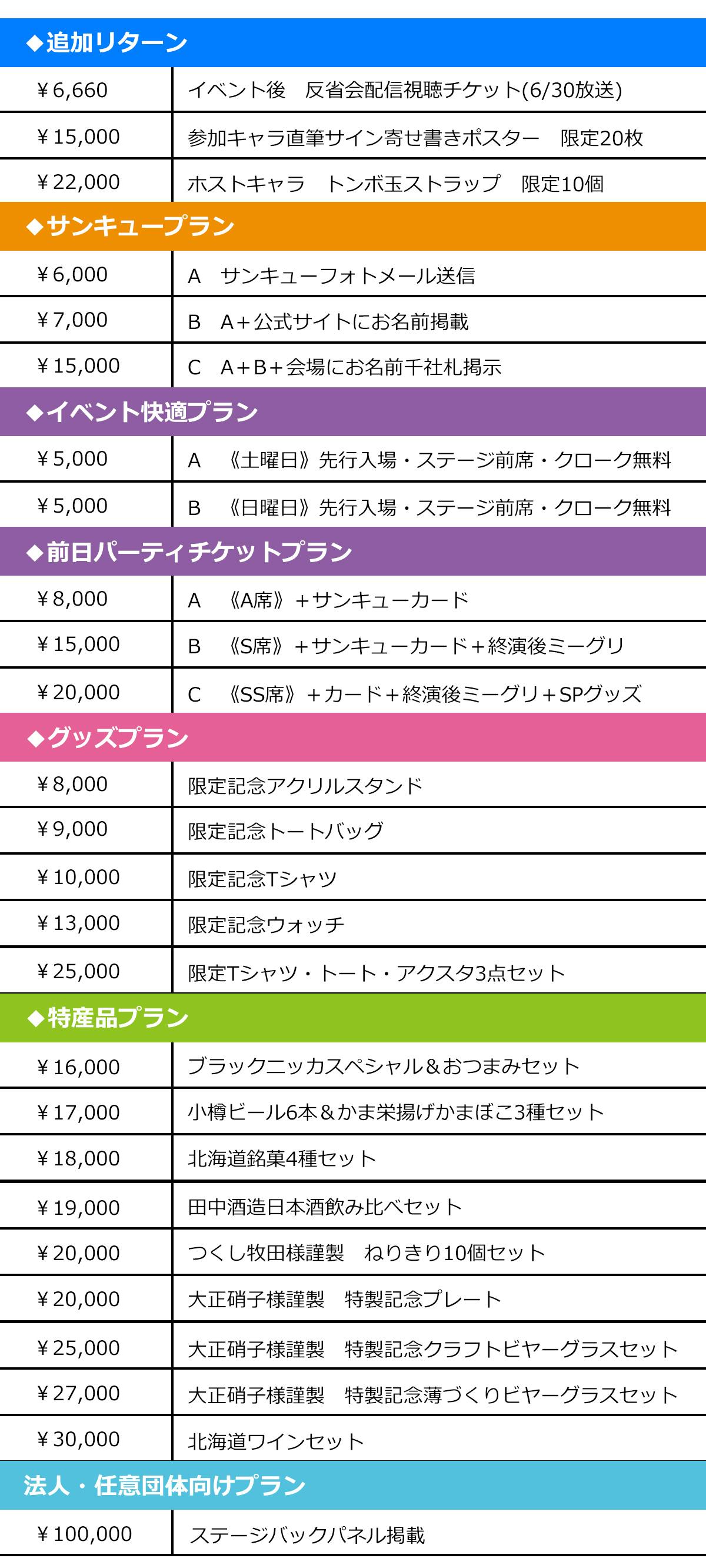 2025/05/29 17:08【2025.7.8 全リターン発送完了のお知らせ】本日、すべてのリターンの発送が完了いたしました。該当のみなさまにはCAMPFIREのメッセージより伝票番号をお知らせしております。ご確認をよろしくお願いいたします。改めて、北海道ご当地キャラフェスタクラウドファンディングへの多大なる温かなご支援、誠にありがとうございました!!!【2025.6.6 発送完了情報更新】イベント開催まで1か月を切り、絶賛準備中の実行委員会です。準備のできたリターンから順次お送りしております!現在のリターン対応状況をお知らせいたします。自分に届いているはずのリターンが未着だという方はメッセージからご連絡ください。【リターンが完了しているもの】《2025.6.6New!》 ★グッズプラン・公式記念Tシャツ ★グッズプラン・公式記念グッズ3点セット ★グッズプラン・公式記念ウォッチ《↓2025.5.29時点情報↓》◆公式サイトへのお名前掲載完了済 https://gotouchi-chara.jp/hokkaido2025/#cf ★サンキュープランB ★サンキュープランC◆ご登録のメールアドレスにPDF添付メール配信+CAMPFIREメッセージにてメール配信のご連絡済 ★快適プランA ★快適プランB◆CAMPFIREメッセージにて整理番号(A席は座席番号も)と当日の流れをご連絡済 ★チケットプランA(ヲタル座A席チケット) ★チケットプランB(ヲタル座S席チケット) ★チケットプランC(ヲタル座SS席チケット)◆CAMPFIREメッセージにて発送伝票番号をご連絡済 ★ねりきりセット(5/27発送) ★日本酒飲み比べセット(5/27発送) ★北海道ワイン飲み比べセット(5/27発送) ★北海道銘菓セット(5/27発送) ★小樽ビール&かま栄セット(5/29-30発送) ★グッズプラン・公式記念トートバッグ(5/30発送)【現在準備中のもの】完成次第発送しますが、イベントまでにお送りできるかはお約束できませんのでご了承くださいませ。 ★グッズプラン・公式記念アクリルスタンド ★小樽特産品プラン・記念プレート ★小樽特産品プラン・クラフトビアグラスセット ★小樽特産品プラン・薄づくりビアグラスセット ★小樽特産品プラン・とんぼ玉ストラップ【現地に掲示するもの】 ★サンキュープランC・会場掲示千社札(会場にお越しの方はお持ち帰りいただけます) ★法人プラン・協賛バナー【イベント終了後(6/23以降)にお届けするもの】 ★サンキュープランA ★サンキュープランB(フォトメール) ★サンキュープランC(会場受け取り分以外の千社札) ★寄せ書きポスター ★後日反省会配信 視聴チケット以上となります!ご自身のリターンをご確認いただき、連絡がきているはずなのに未着のものがあればメッセージからお知らせください。よろしくお願いいたします! もっと見る