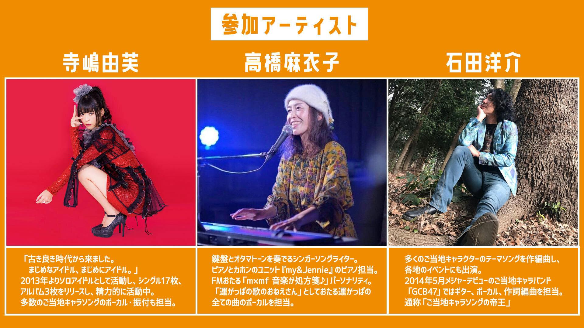 多くのご当地キャラクターのテーマソングを作編曲し、各地のイベントにも出演。