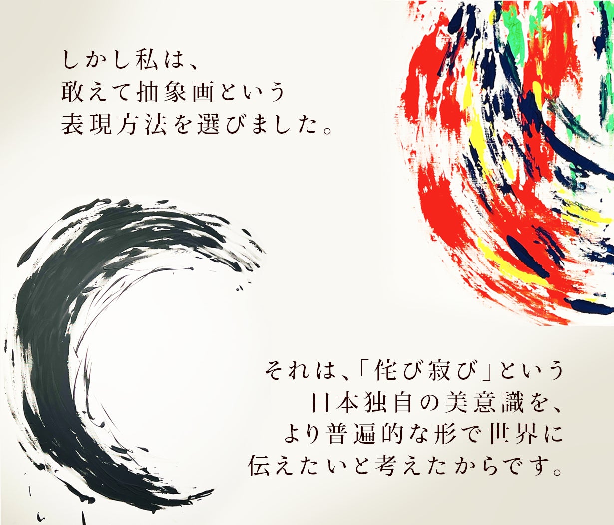 日本の伝統的な「侘び寂び」の要素を抽象画に取り入れ、ベルギーやアムステルダムでの国際展示会、