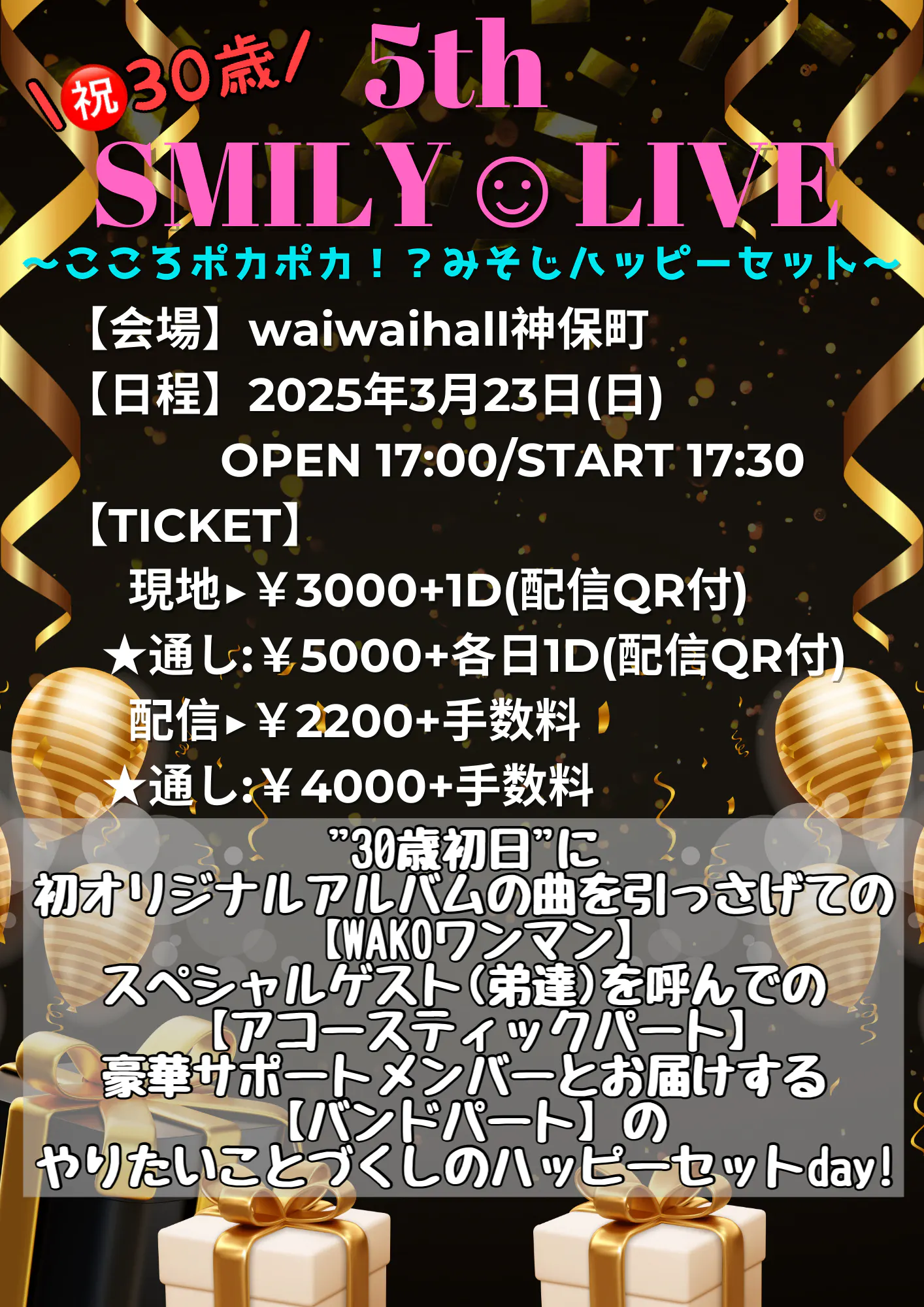 2025年3月23日(日)waiwaihall神保町で行われるWAKOのバースデーライブイベント2日目です。30歳の生誕祭になります!