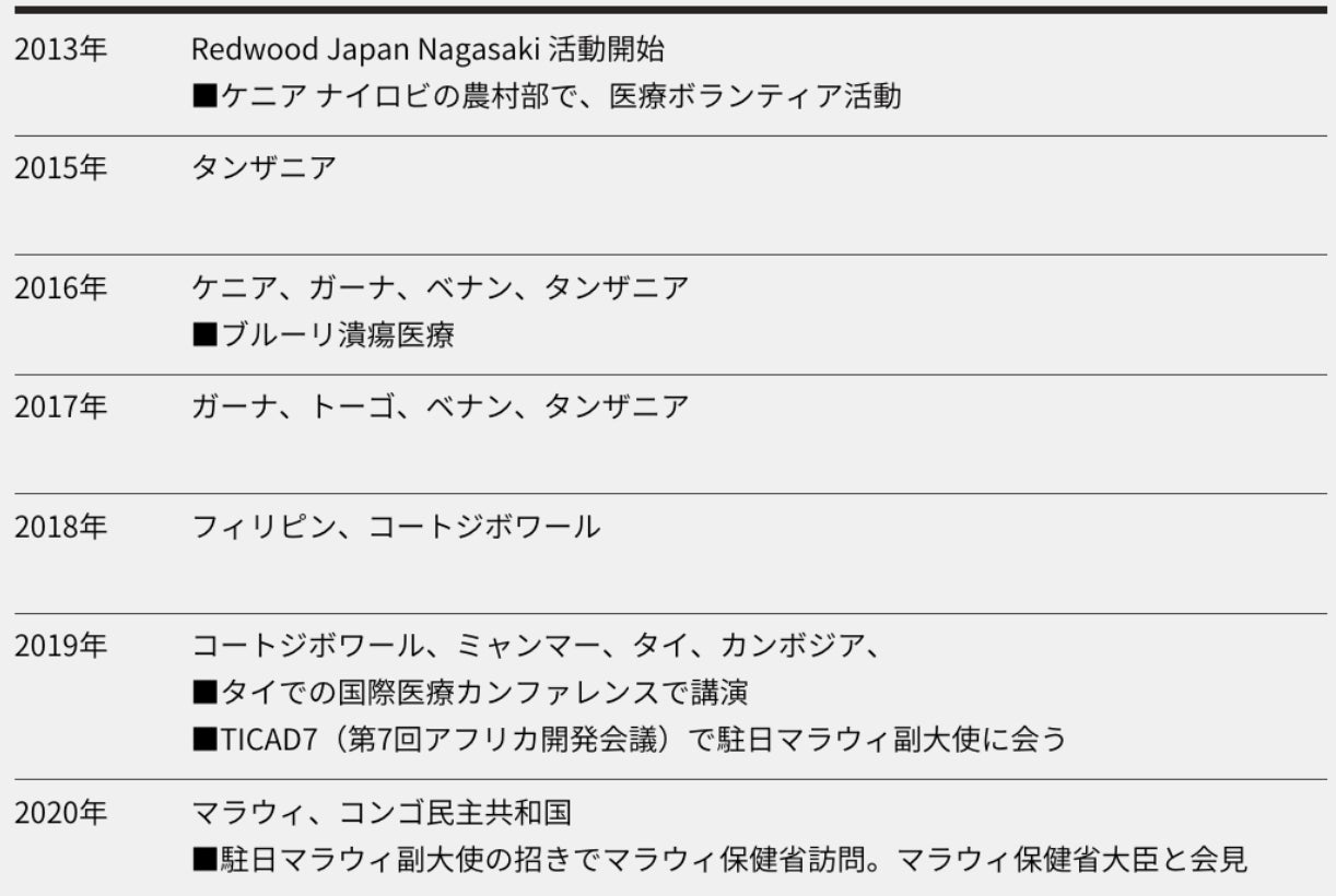 私は広島大学医学部を卒業後、米国セントルイス・ワシントン大学医学部で研究員を務めた後に帰国し、細胞生物学、分子生物学の研究をしておりましたが、クリスチャンとしてアフリカの医療を志し、長崎大学医学部 熱帯医学研究所で熱帯医学や地域医療の専門知識を深めながら、2013年にRedwood Mission を立ち上げました。Redwood(セコイアの木) がその根をお互いに絡ませて支え合いながら成長するように、地域の人々が医療を支え合う基盤を作りたい、そんな願いを込めています。