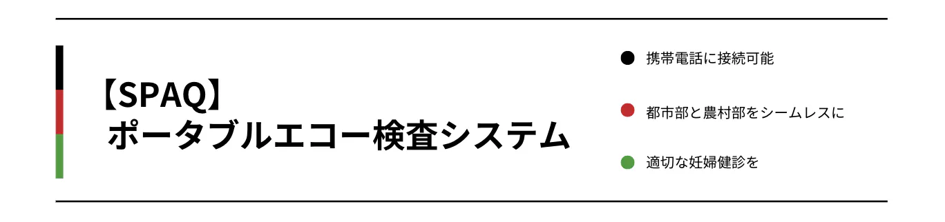 この危機的状況を改善するため、革新的なポータブルエコー検査システム「SPAQ」を導入し、これまで医療アクセスのなかった地域に持続可能に新たな命を守る仕組みを作ります。