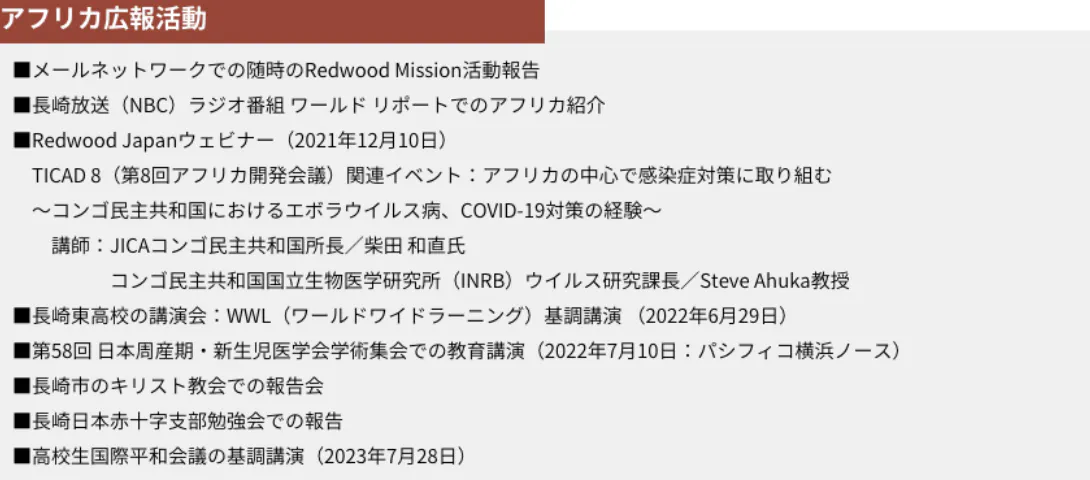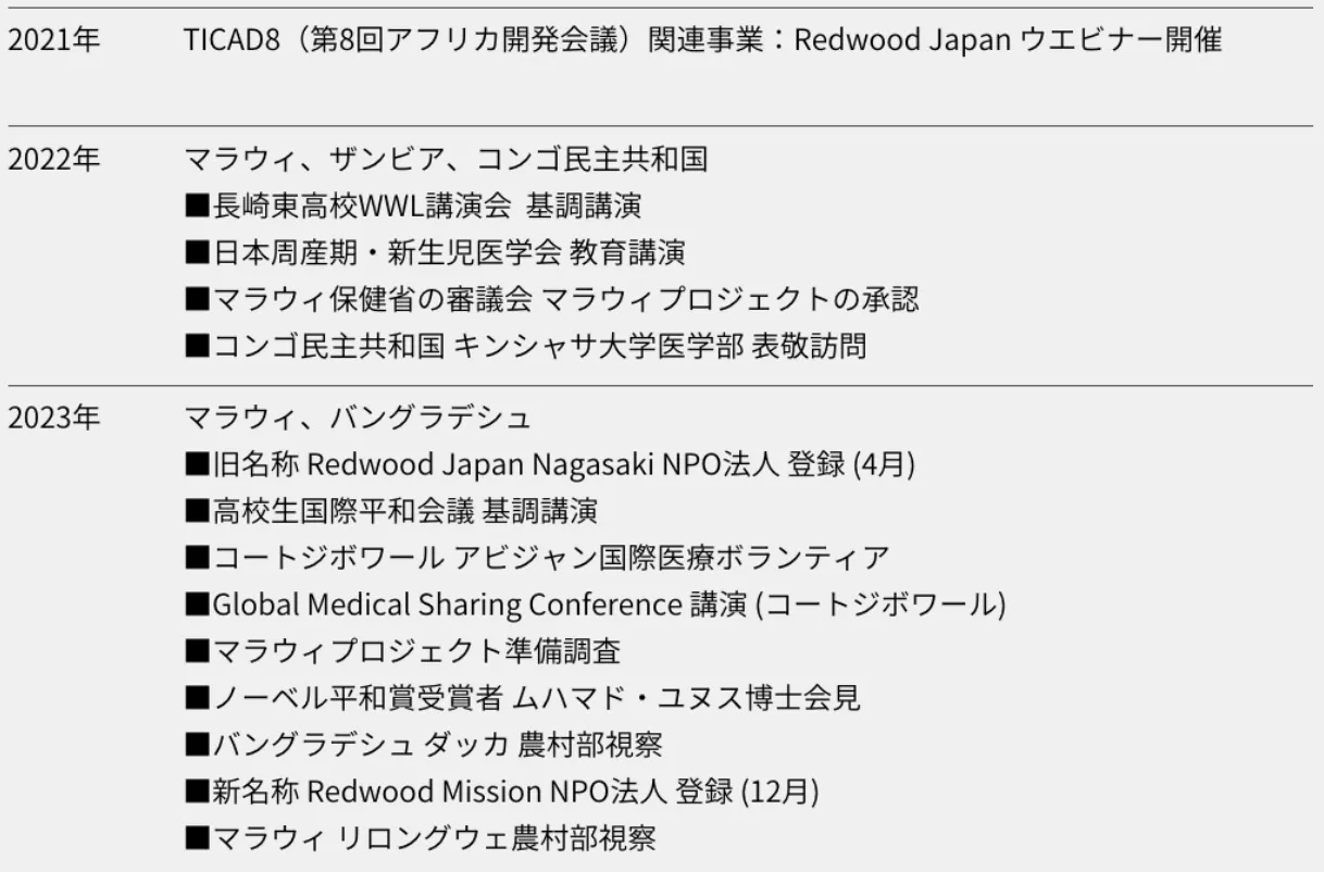 最後になりますが、NPO法人Redwood missionのこれまでの活動について記載させていただきます。