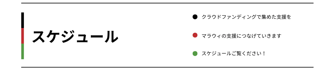 今回のプロジェクト下記スケジュールで想定しています。なお、アフリカのご状況などによって前後する可能性はございますので、ご理解いただけますと幸いです。