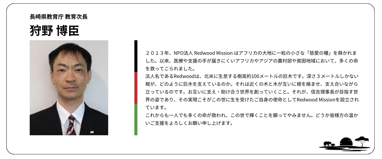私は広島大学医学部を卒業後、米国セントルイス・ワシントン大学医学部で研究員を務めた後に帰国し、細胞生物学、分子生物学の研究をしておりましたが、クリスチャンとしてアフリカの医療を志し、長崎大学医学部 熱帯医学研究所で熱帯医学や地域医療の専門知識を深めながら、2013年にRedwood Mission を立ち上げました。Redwood(セコイアの木) がその根をお互いに絡ませて支え合いながら成長するように、地域の人々が医療を支え合う基盤を作りたい、そんな願いを込めています。