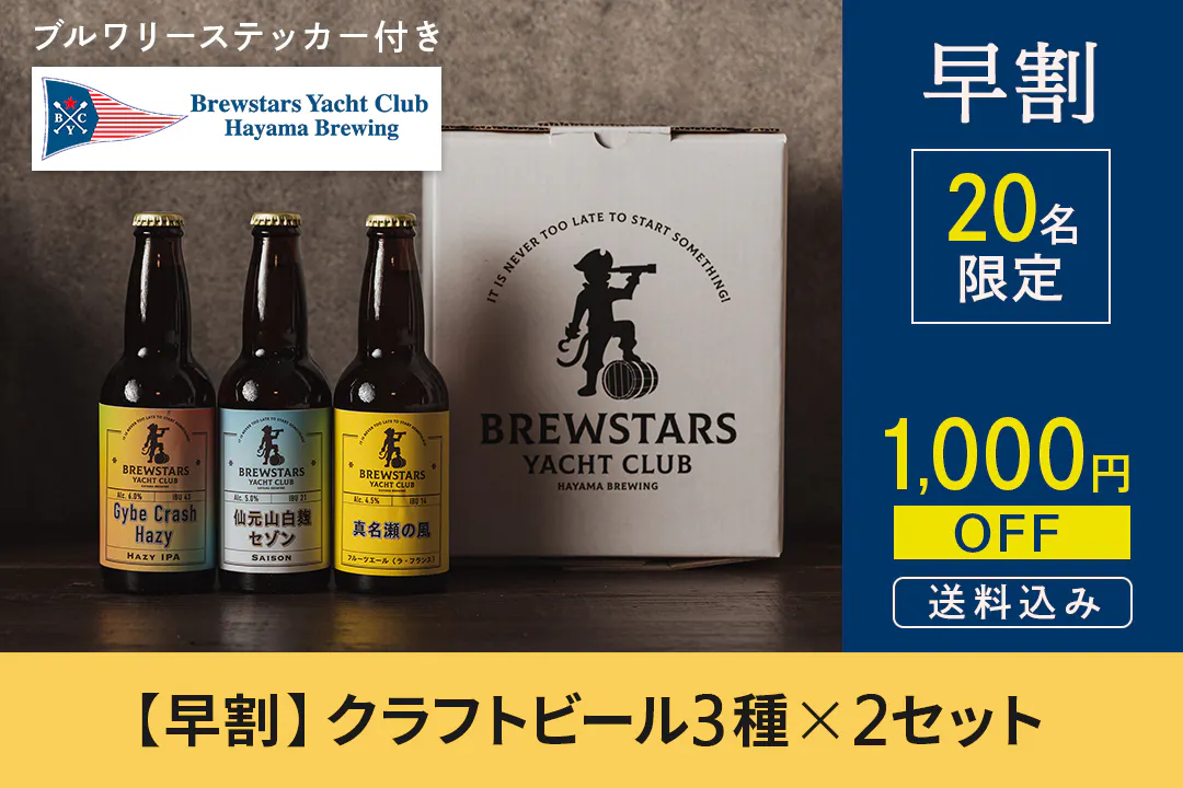 クラフトビール3種を2セットで合計6本をお送りさせていただきます。 20名様限定で通常7,000円のリターンを1,000円引きで6,000円です。