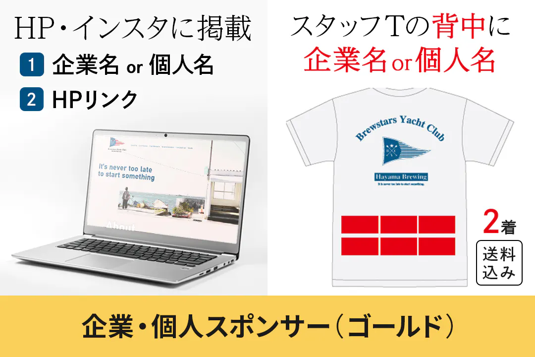 6社限定でBrewstars Yacht Club Hayama Brewingの企業・個人スポンサーゴールドになれる権利です。 Brewstars Yacht Club Hayama Brewing のHPとインスタグラムにあなたの企業名または個人名とHPのリンクを掲載させていただきます。 Brewstars Yacht Club Hayama Brewing のHPとインスタグラムであなたの会社をPRできます。 さらにBrewstars Yacht Club Hayama Brewing のスタッフTシャツの背中にあなたの企業名または個人名を掲載させていただきます。