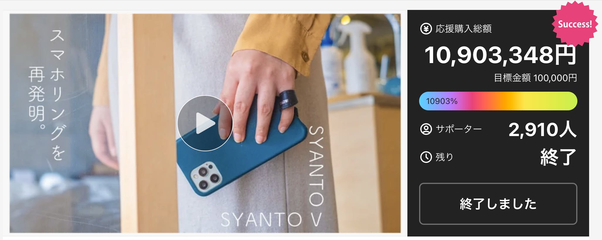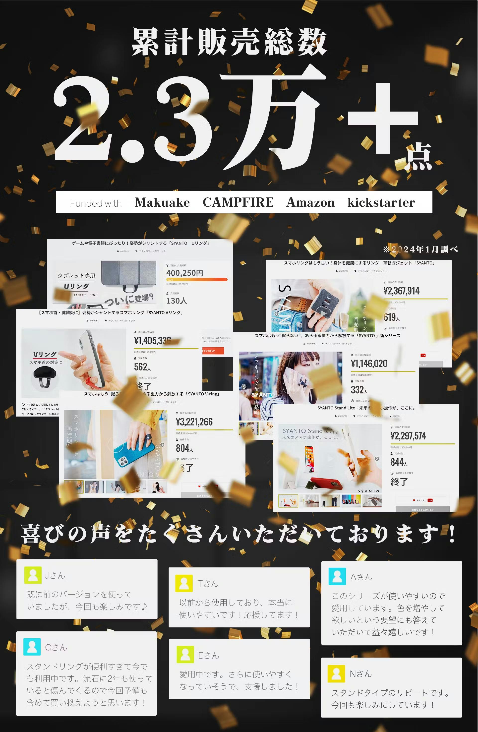 SYANTOはこれまでにMakuake、CAMPFIRE、machi-ya、米国kickstarter、Amazonで累計2.3万人以上の方から支援をいただき、多くの方のスマホ操作の悩み解決に貢献してきました。