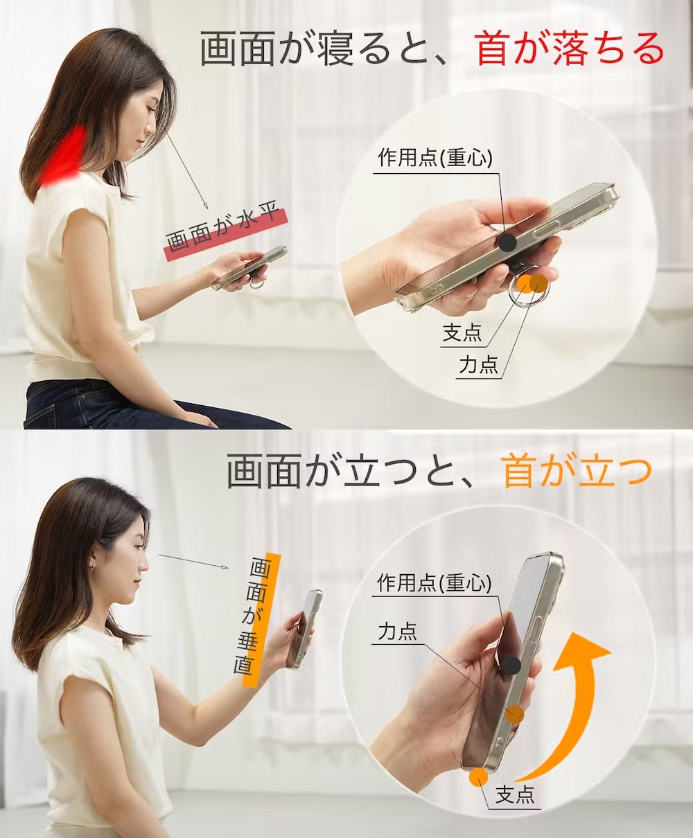 これは首が落ちた状態でスマホを使っているからかもしれません。SYANTO独自の底面取り付けにより、スマホ画面が自然と垂直になりやすくなります。それにより首が落ちづらくなり、首への負担軽減、及び姿勢が起きることが期待できます。