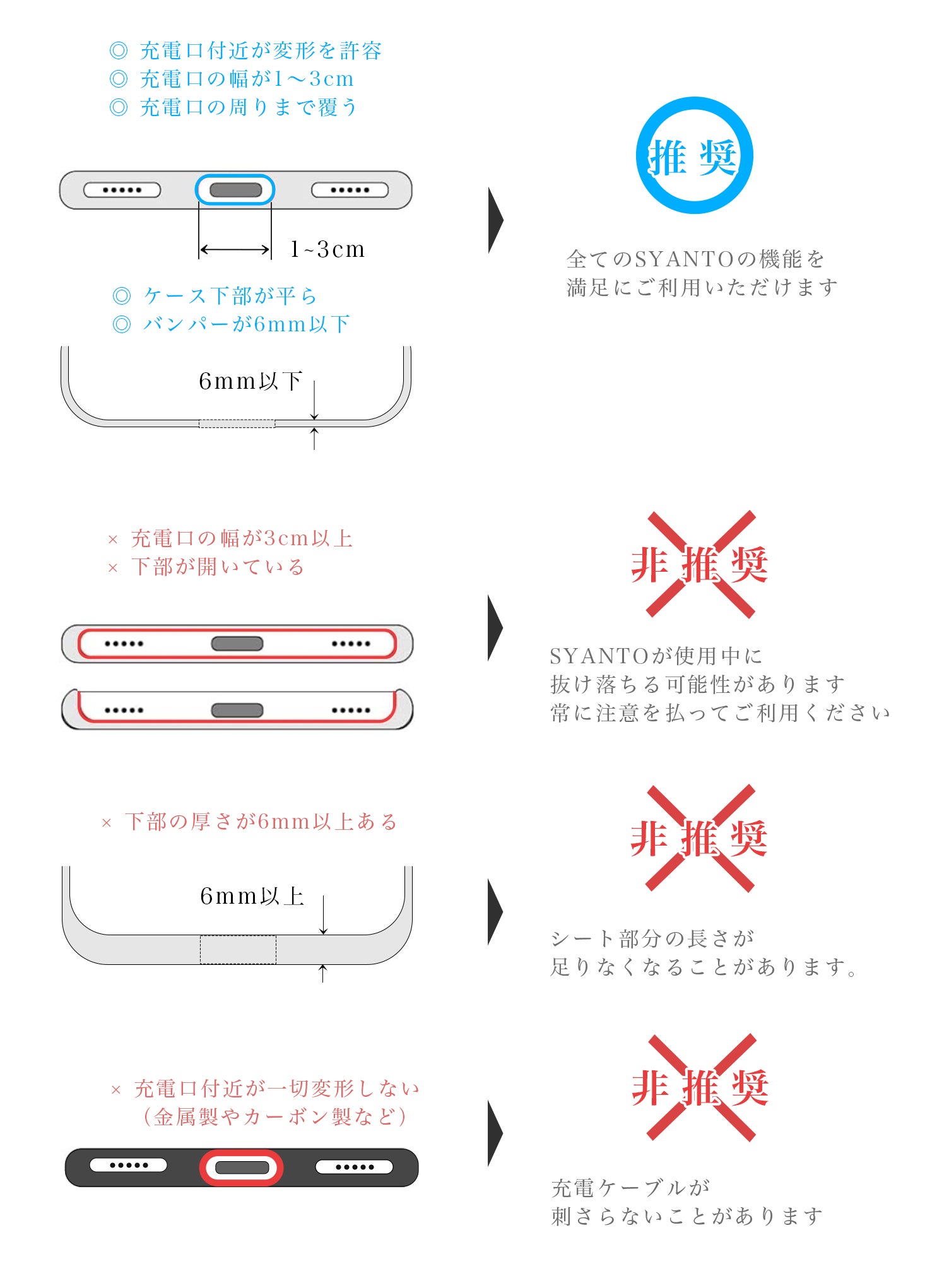 SYANTOは様々な機種やケースに対応できるように設計されています。一部対応できないケースがございますので、事前によくご覧になるようお願いいたします。