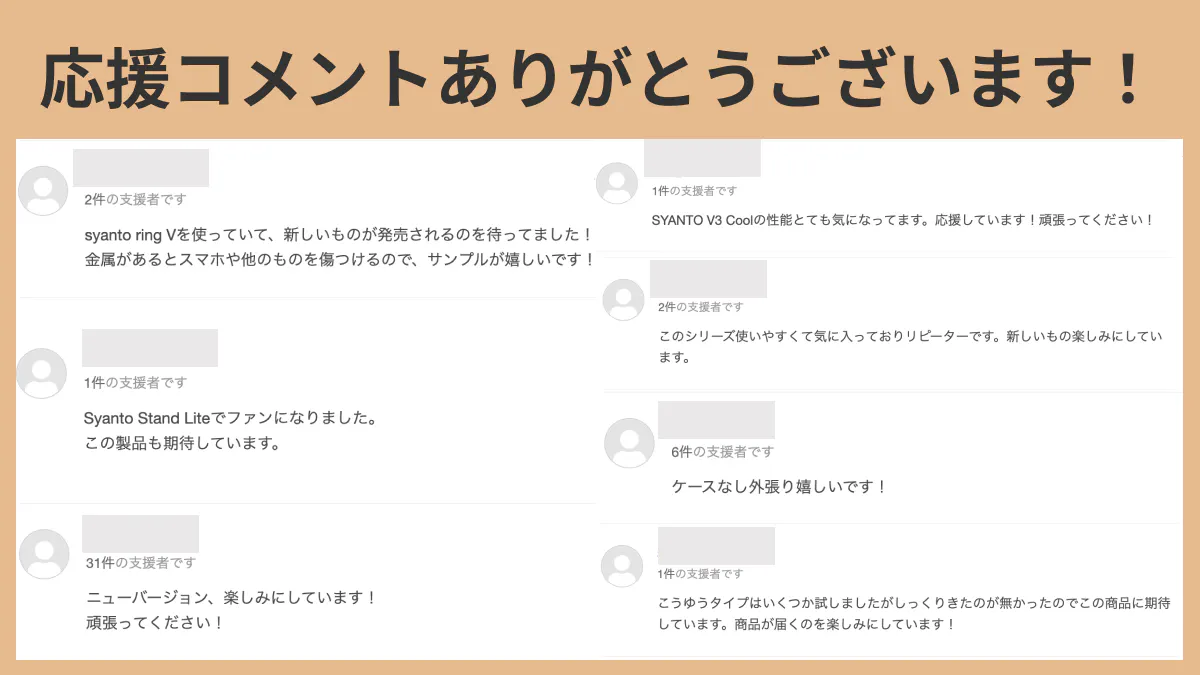 「SYANTO V3 Coolの性能とても気になってます。応援しています!頑張ってください!」