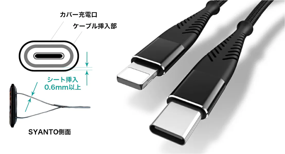 また、SYANTOのシート厚さは0.6mmのため、ケースとケーブルは充電口径とケーブル挿入部に0.6mm以上の隙間ができる組み合わせのものをお選びください。