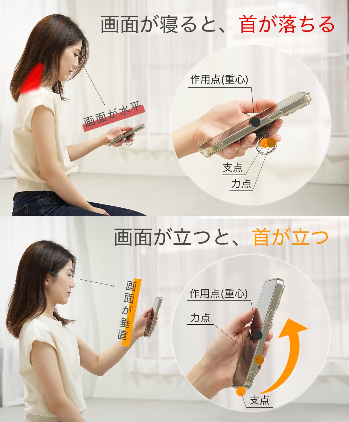 SYANTOは背面取り付け方のリングとは重心に対する支点と作用点の位置が異なるため、自然とスマホ画面が垂直になりやすくなります。スマホ画面が垂直になることで、首が落ちづらくなり、首への負担軽減を期待できます。