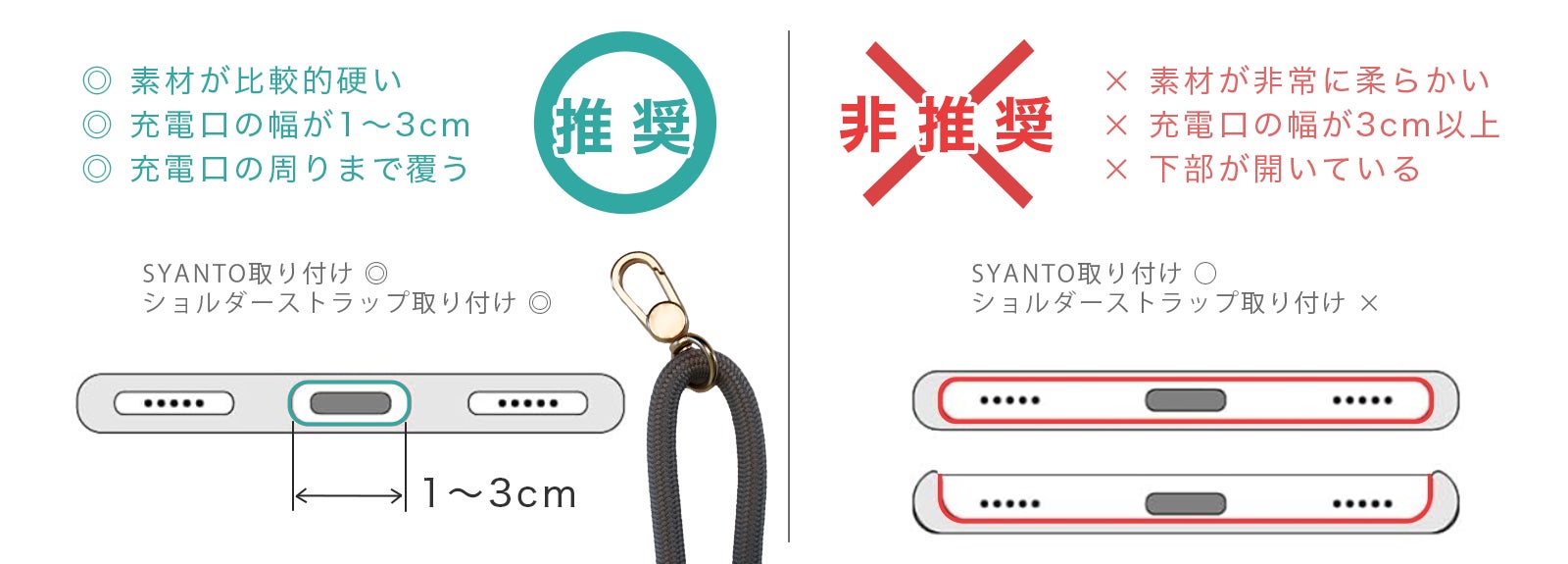 また、SYANTOのシート厚さは0.6mmのため、ケースとケーブルは充電口径とケーブル挿入部に0.6mm以上の隙間ができる組み合わせのものをお選びください。
