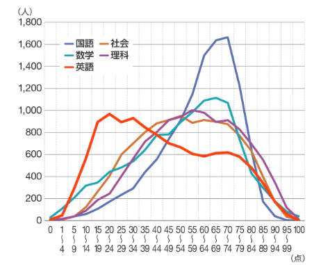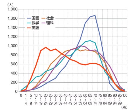 以下は群馬県の例です。他の4科目はピークが1か所なのに対し、英語は20点代前後と70点代前後の2か所にピークがきています。