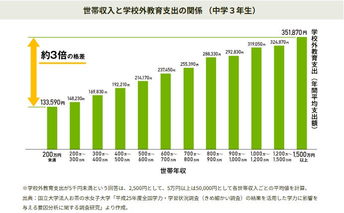ここ数年、家庭環境や経済状況による格差の広がりが問題になっています。世帯年収の違いによって、習い事に行ける子供とそうでない子供の差が際立つようになり、「学力格差」「体験格差」が広がっていると言われています。