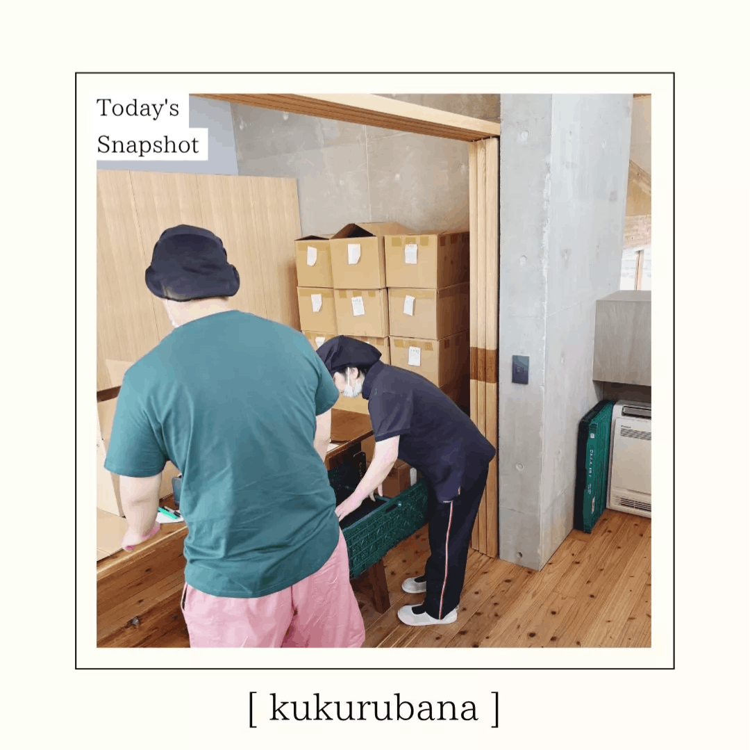 今日は作業の様子をお伝えします。くくるばなでは毎日いもチップスの製造を行っています。色々な作業があるのですが、写真は「納品準備作業」の様子です。注文書の通りに数をそろえて商品を段ボールに詰めていきます。出荷前最終検品の後、出発前に納品車両に積み込んでいきます。KさんとUさんは、二人で声を掛け合いながら次々に納品の準備を進めていきます。明るい雰囲気でとても頼りになるメンバーです。