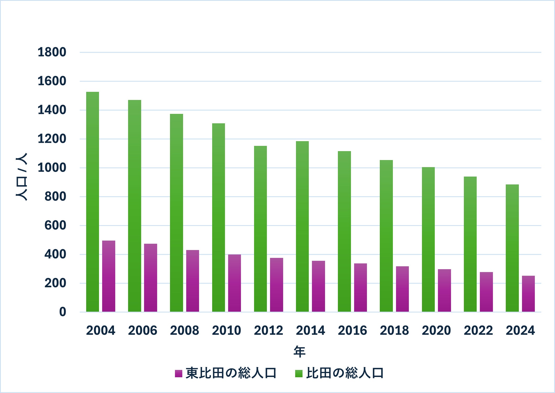 図10に示すとおり,比田地区では人口の急激な減少と高齢化が進み,地域の活力が低下しつつあります。具体的には,東比田を含む比田地区全体の人口は,2004年から2024年の20年間で1,526人から885人へと42ポイント減少しました。