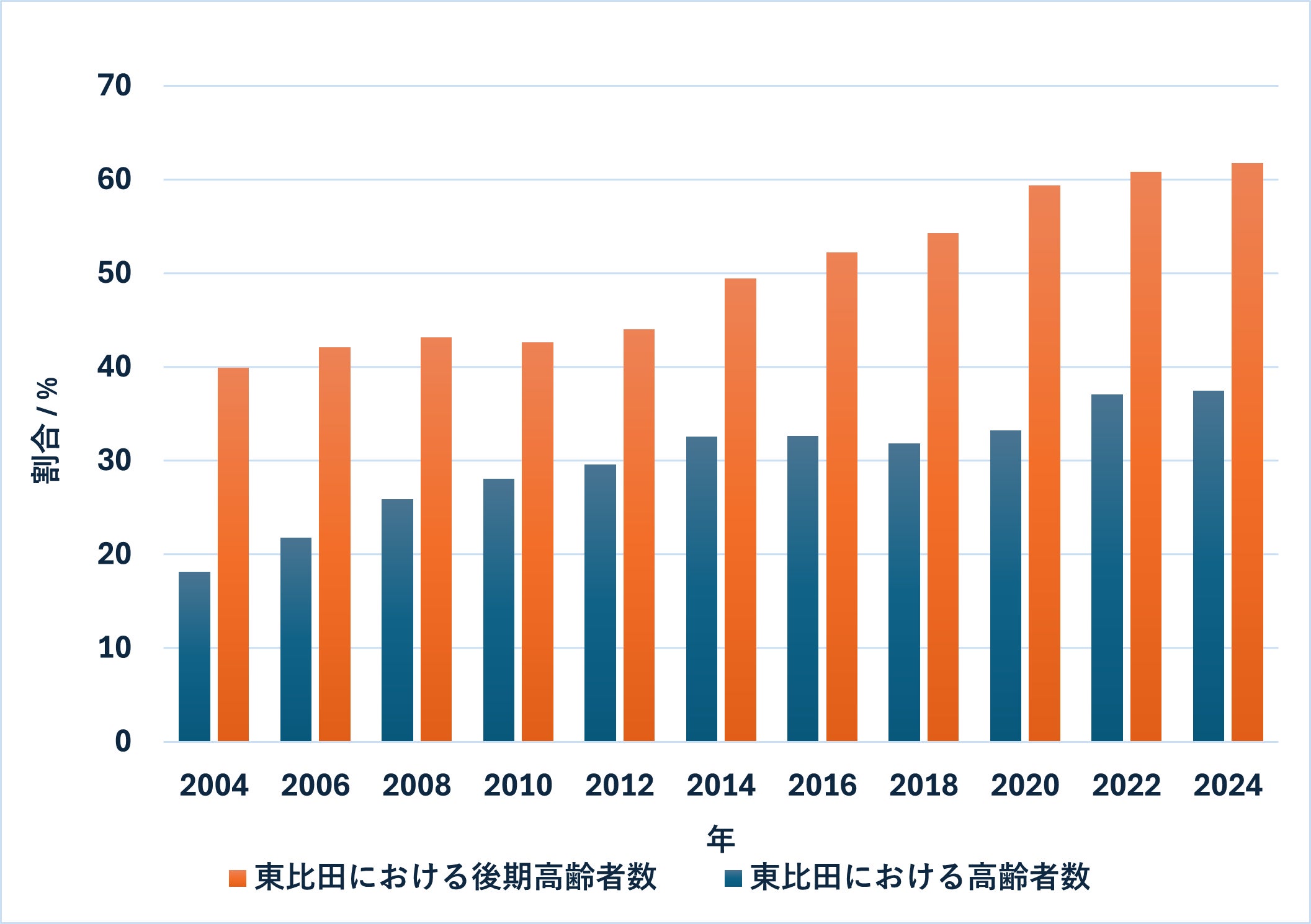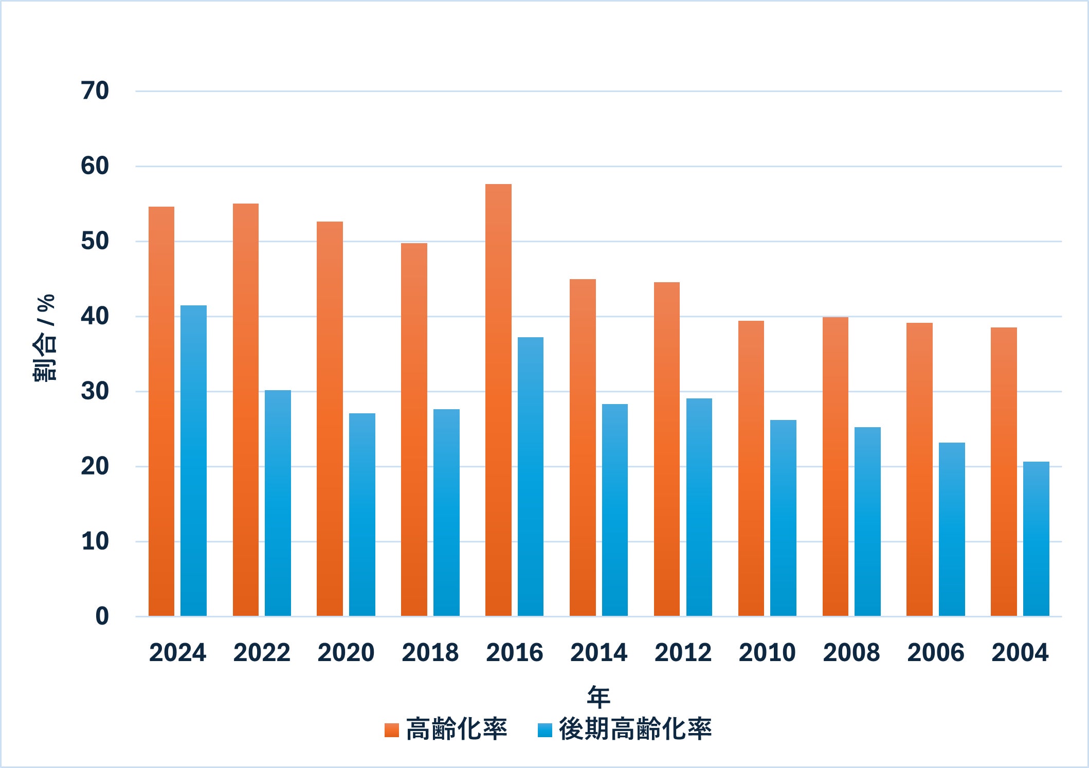 更に,図11に示すように,65歳以上の高齢者および75歳以上の人口は減少傾向にあるように見えますが,実態としては若年層の人口増加が見られない一方で,高齢者の死亡などによる人口減少が進行しています。東比田を例にみると,2014年から2024年にかけて高齢化率が急速に上昇しており,地域の高齢化が加速していることが明らかになっています(図12)。