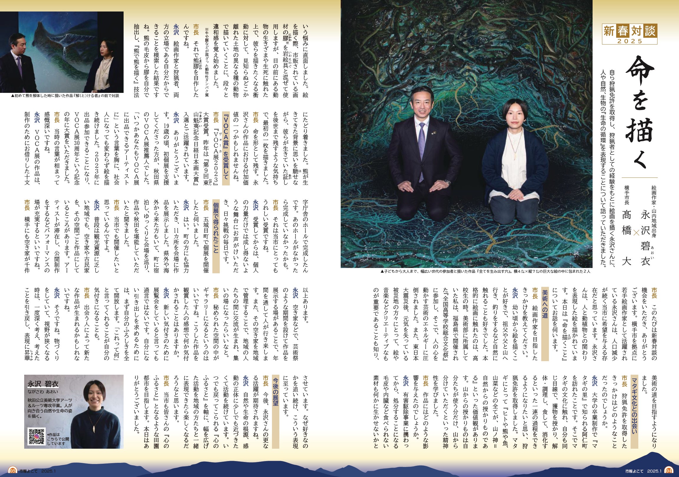 市報よこて 2025年1月号を見ていると、タイムリーな記事が載っていました。新春対談【命を描く】絵画作家永沢碧衣さんと横手市長の対談、見開きカラーページ。今回のAIRとも関連する問題意識が永沢さんの言葉で語られておりましたので一部ご紹介します。本プロジェクトの中で、2月7日(金)に映画監督 山﨑樹一郎と絵画作家 永沢碧衣による公開対談を予定しています。当初、横手駅前Ao-naでの開催を考えておりましたが、もっと相応しい横手城下某所に会場変更となる予定ですのでお楽しみに!(マタギ文化との出会い)【永沢】熊が生きてきた背景に想いを馳せながら、彼らが生きていた証しを後世まで残すような気持ちで、最初の一枚を描きました。(個展で得られたこと)【市長】五城目町で個展を開催したと伺いました。【永沢】はい。町の方にも協力いただき、11カ所を会場に作品を展示しました。県外や海外から来た方もいて、町に宿泊し、ゆっくりと会場を巡り、作品や秋田を堪能していただいたと聞きました。【市長】当市でも開催したいと思っているんですよ。【永沢】普段は観光資源に乏しい地域でも、空き家や古民家を、その空間ごと作品にしているところがあります。アーティストが滞在し、公開制作をするなどパフォーマンスの場が充実するといいですね。【市長】横手にも空き家が千件以上あります。【永沢】空き家などで、芸術祭のような期間を設けて作品を展示する場があることで、年間を通して人が行き来します。また、空き家を地域で管理することで、地域の人たちの間に交流が生まれ、集いの場になったらいいなと。【市長】秘められた空間の中がギャラリーになるというのはいいですね(後略)(今後の展望)【永沢】自然や生命の根源、感動の正体に少しでも近づきたくて活動を続けています。いつでも戻ってこられる『心のふるさと』を軸に、幅を広げた活動を地域の方たちと一緒に表現できたら楽しくなるだろうなと思います。【市長】当市も皆さんの『心のふるさと』になるような田園都市を目指します。